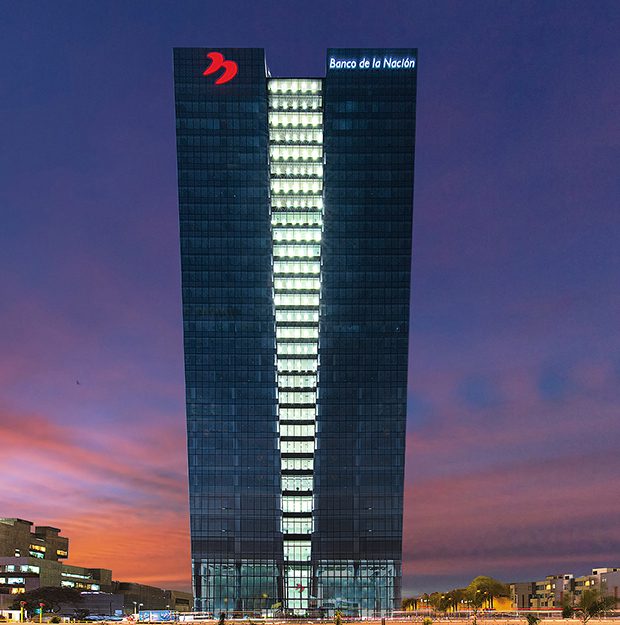 The tower consists of a square plan with two light angles that adapt to the geometry of the terrain to position itself in the corner. This allows greater visibility and frees space for better use of the land. In its last floors the plant gradually withdraws from the southeast corner. This retreat creates a profile against the sky and a series of terraces on the upper floors. Eventually, it hides the cooling towers and other equipment, adding height and presence in the new metropolitan silhouette of Lima. The shape reorients the building towards the center of the new financial district of San Isidro and presents frontality from the Paseo de la Republica and Javier Prado. At the same time, it presents a slender profile from the center of Lima. The building expresses itself different from each side, constantly changing creating intrigue and interest.