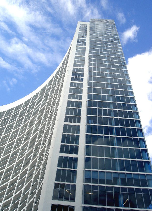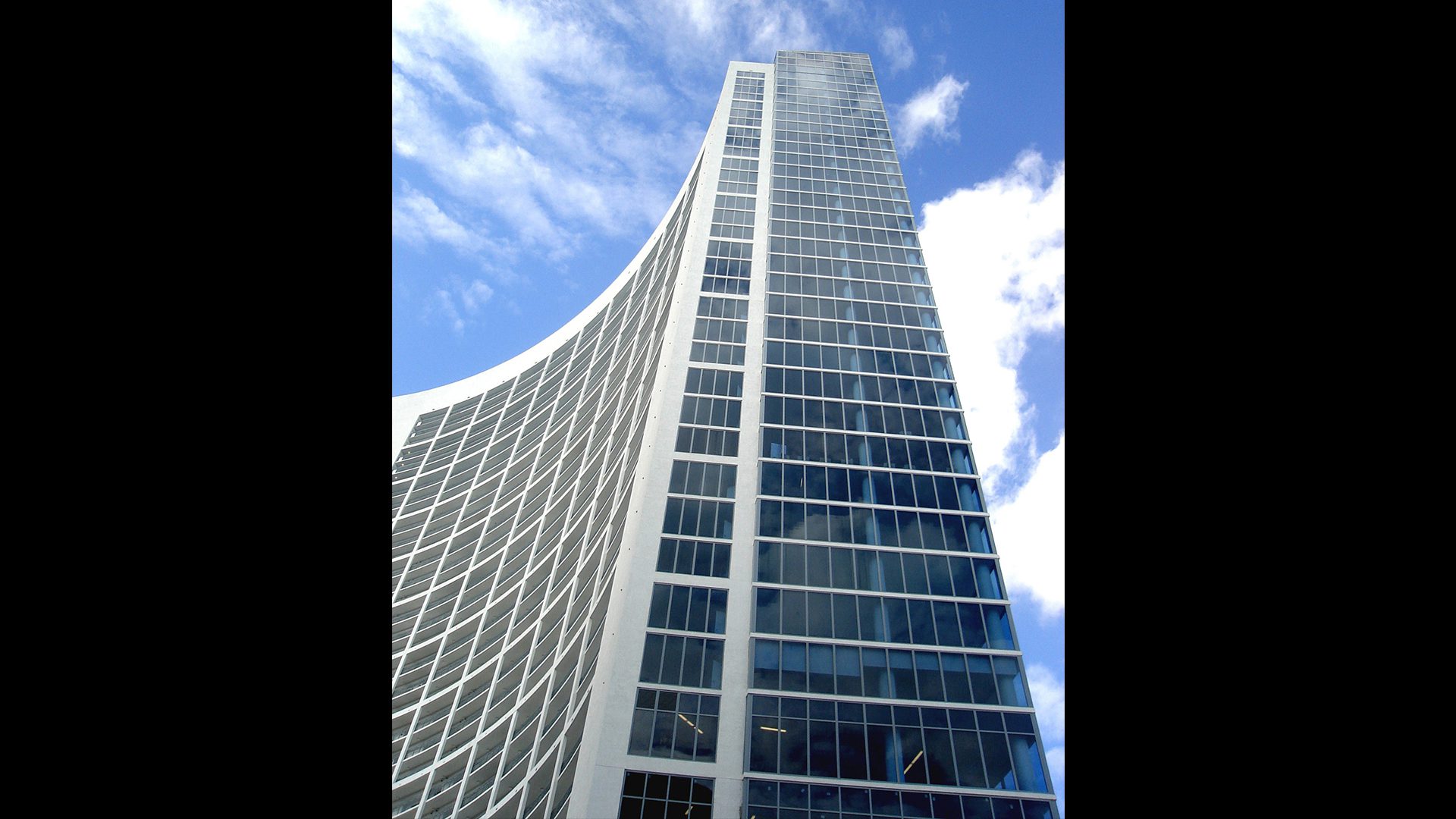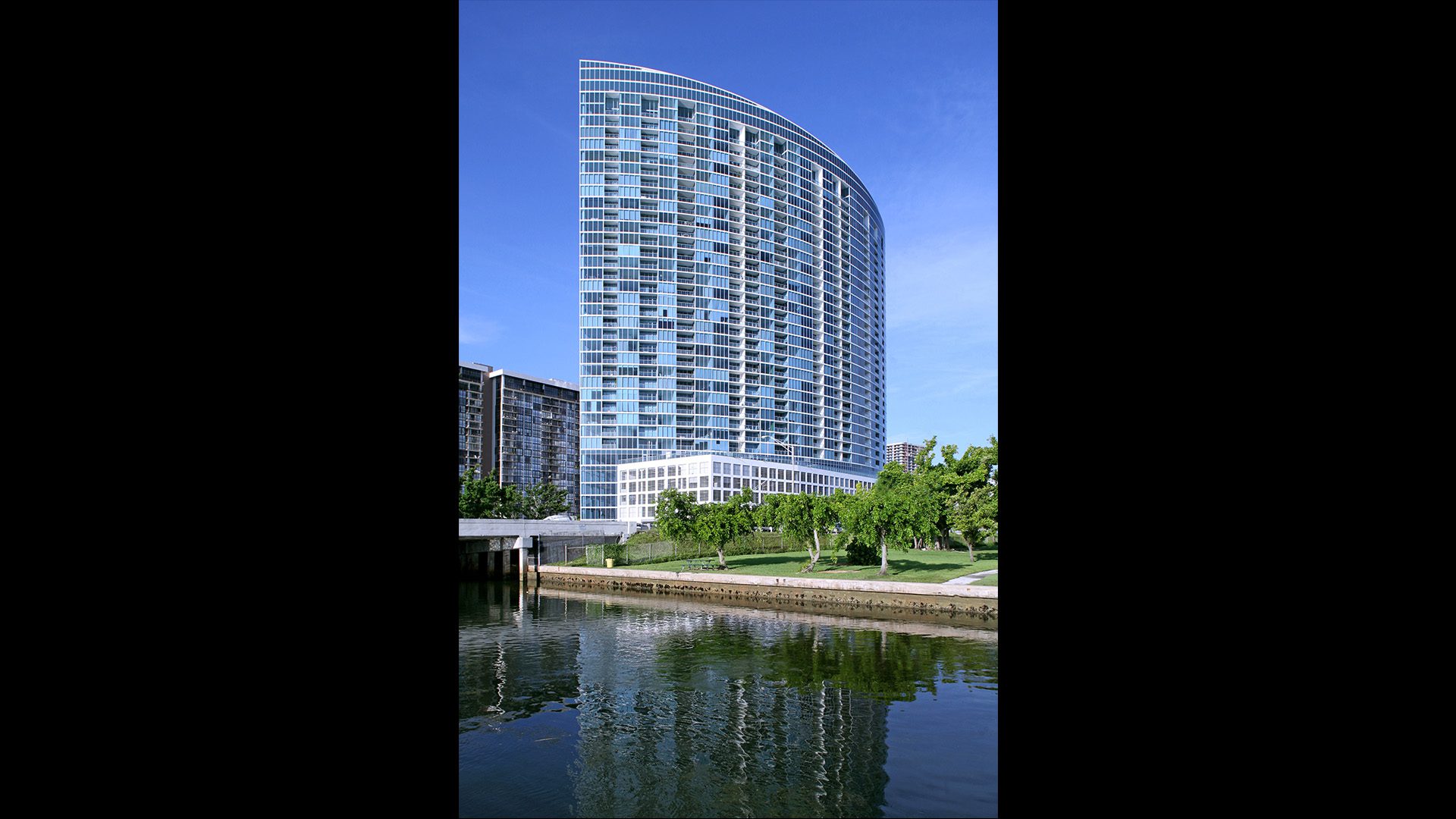 Arquitectonica designed a cutting-edge first impression for guests and visitors by developing linear waterwall which sets the tone for the curvilinear lobby space. The tower rises from a man-made plateau that serves to conceal the parking garage below and provides a unique setting for the amenities. It also raises the lowest apartment level to an elevation that captures the views and separates it from the street activity, to create a secluded amenities enclave.