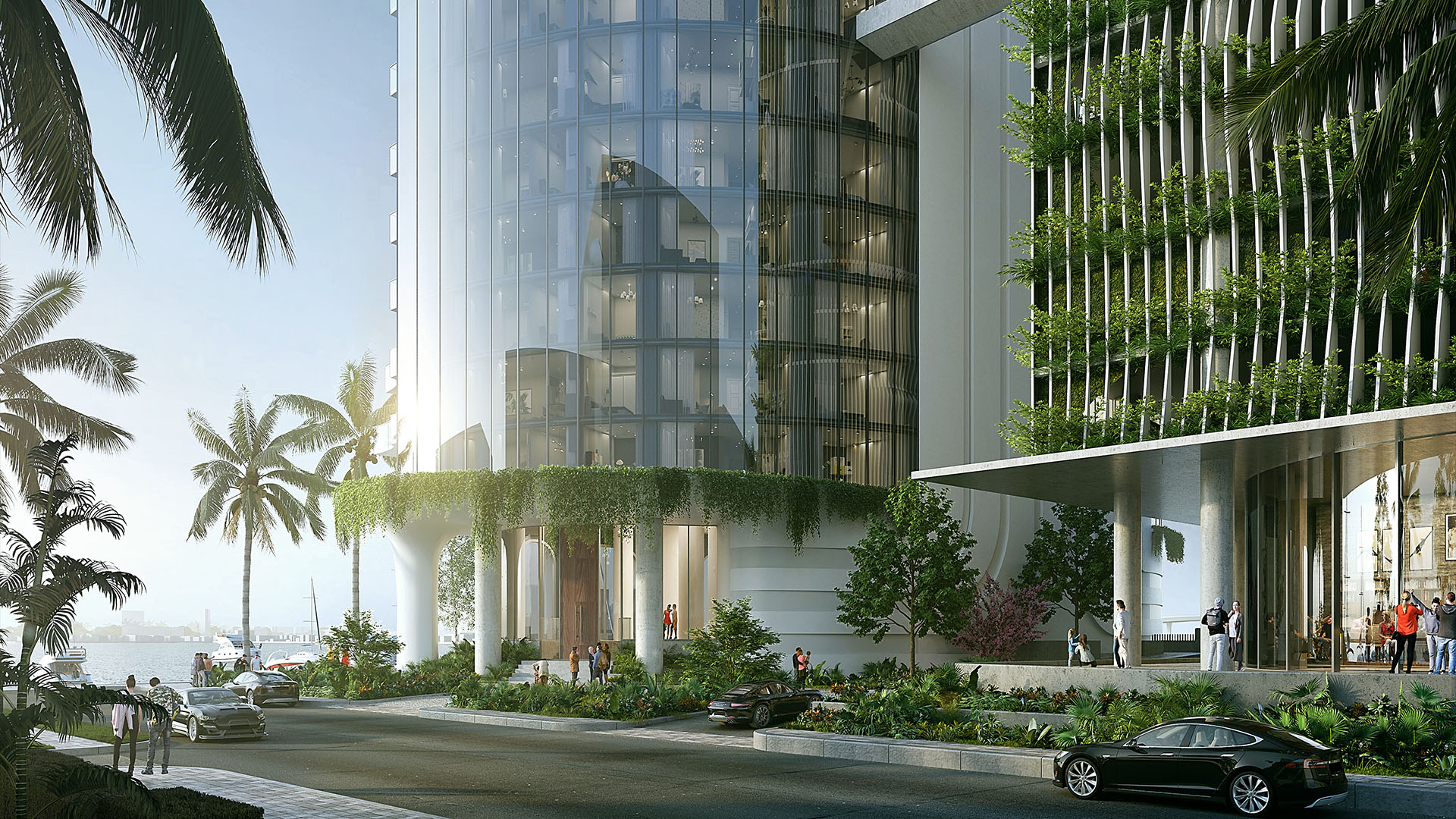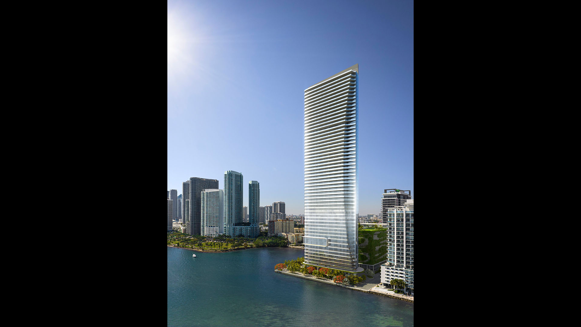 Each residence offers panoramic views of Biscayne Bay and Miami Beach, complemented by a coastal veranda. Amenities line the bayfront, while upper levels host a western deck with a lap pool and sports fields. Residents enjoy a fitness center, private elevators, and an exclusive bay-facing clubroom.