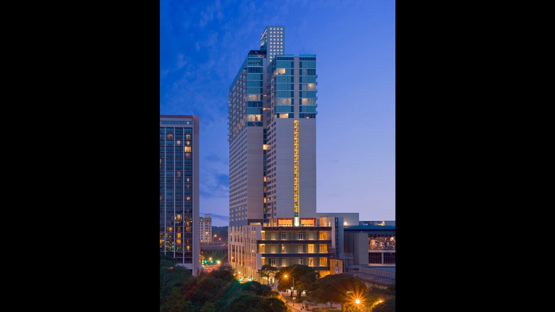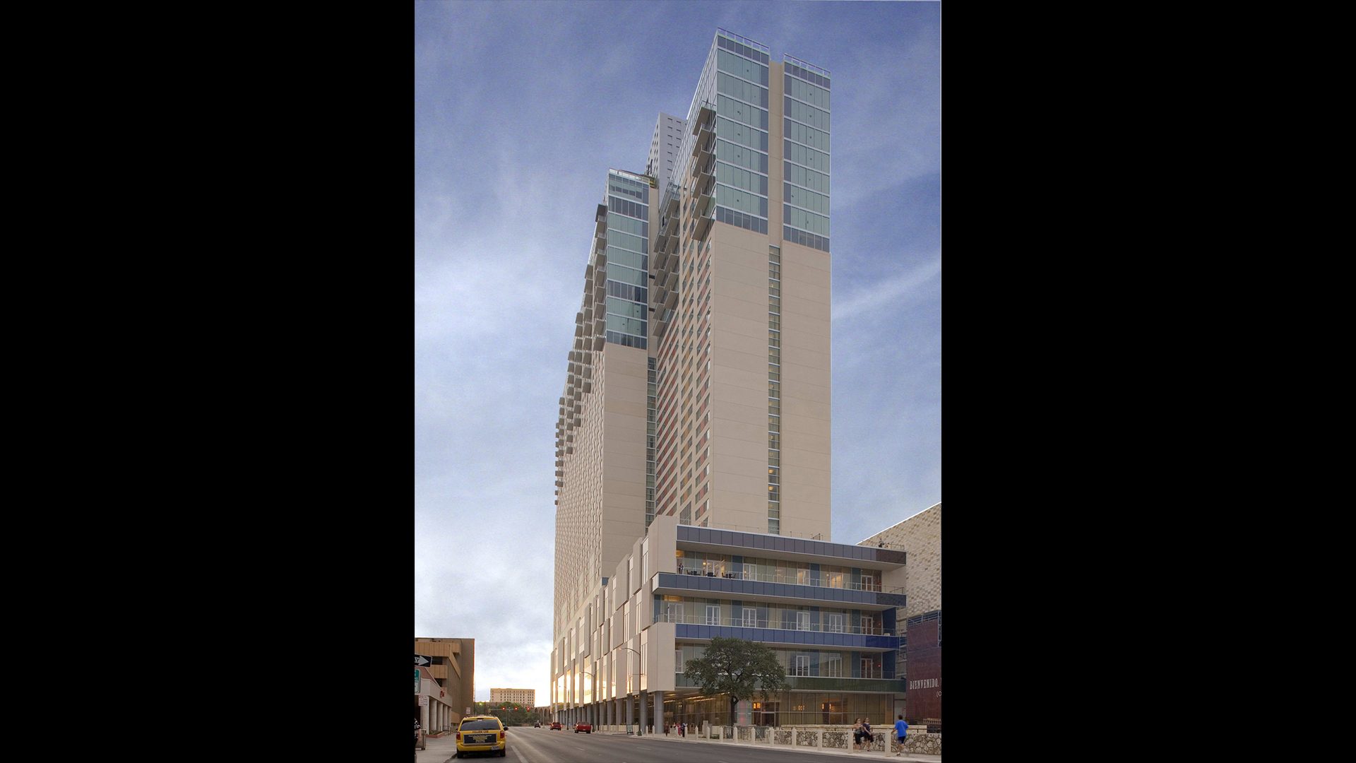 The building features a health club and two pool decks, one for the hotel at level five, and a rooftop pool and terraces for condominium residents. At 525 feet (160 meters), it is the second tallest structure in San Antonio. The complex is adjacent to the city’s newly expanded convention center, the historic Lila Cockrell performing arts center and rises next to the famous San Antonio RiverWalk. An entry plaza to the theater and convention center links them to the lobby and lounge of the hotel. On the second basement level, a restaurant and bar connect directly to the San Antonio Riverwalk. Additionally, five levels of underground parking provide a total of more than 1000 parking spaces.