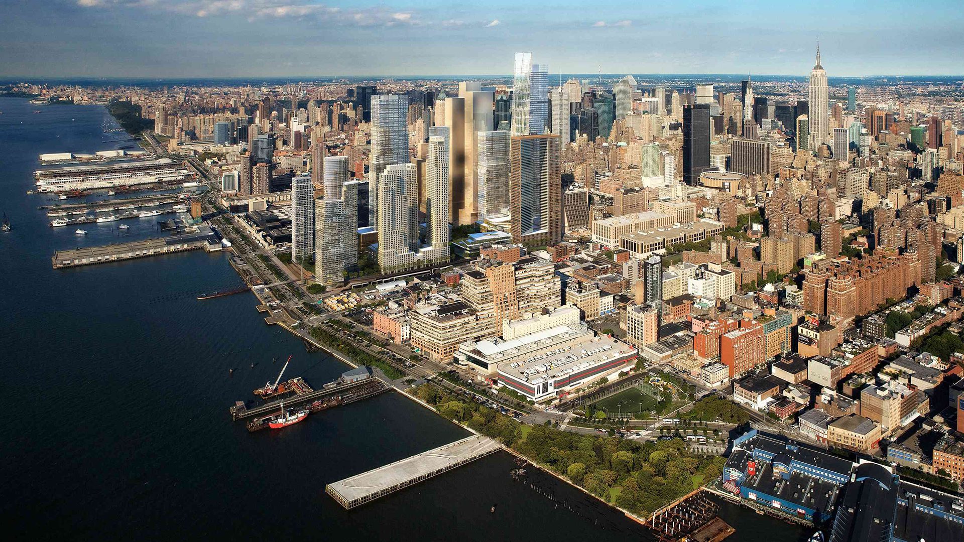 The team created a linear park that runs from 10th Avenue to the Hudson River. Along the perimeter of this space are residential towers, placed to maximize river and park views, a hotel tower, two office towers, retail, a cultural facility, and a New York City school. The High Line, an abandoned elevated railway that runs through Chelsea and down the west side of Manhattan, is incorporated into the scheme as a pedestrian esplanade from the south.