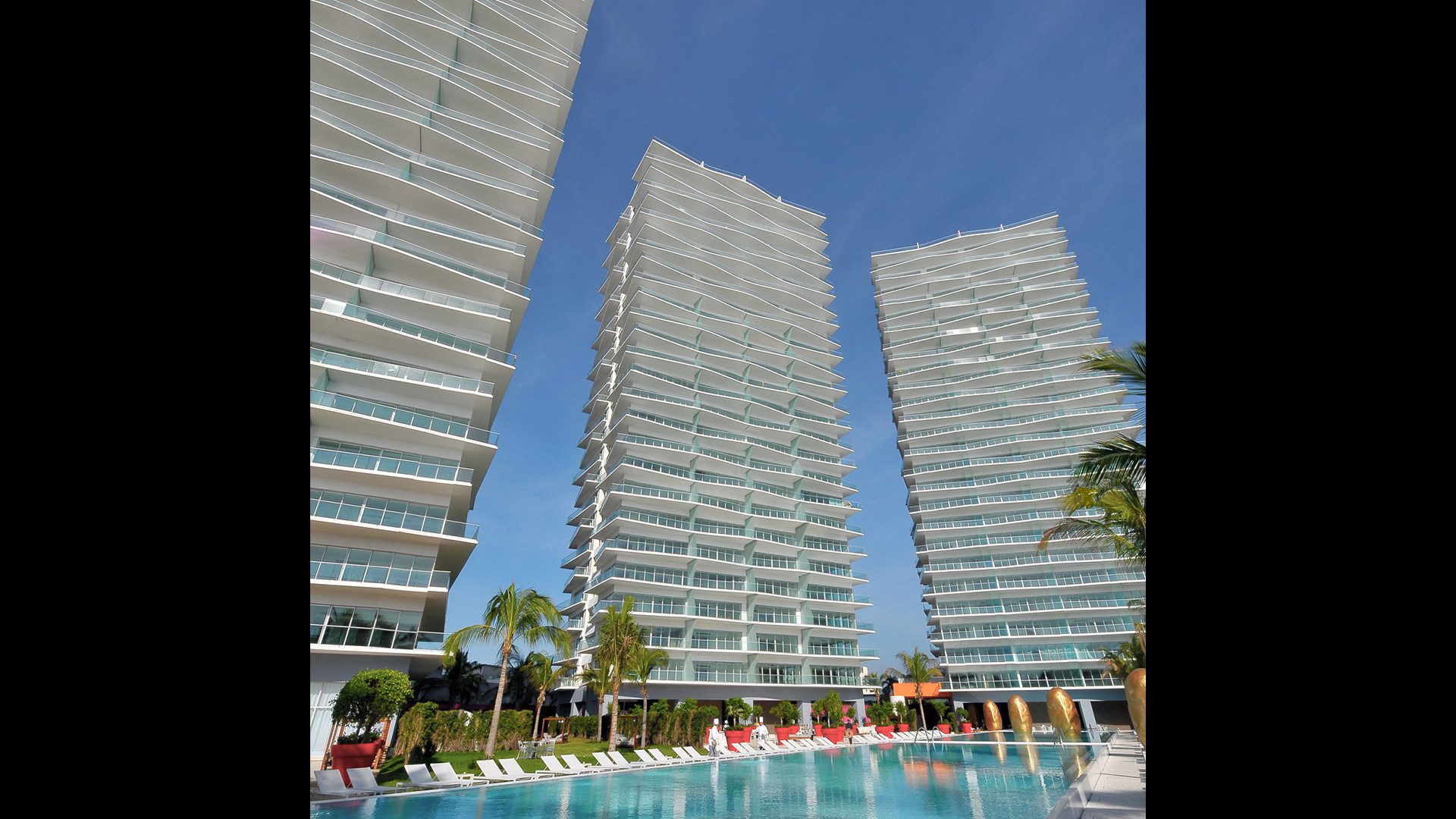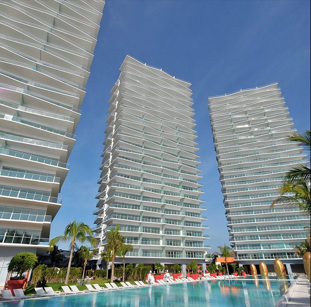The Icon Vallarta luxury waterfront condominium project consists of three 26-story towers, each offering unobstructed views of the Pacific Ocean, nearby mountains and the quaint winding streets of downtown Puerto Vallarta. Arquitectonica’s design for this 633,000 SF (58,800 SM) development includes 342 full-ownership condos consisting of 1, 2 and 3-bedroom units that engage the surrounding environment and allow for tenants to experience Mexico’s famous tropical sunlight and warm ocean breezes. These units range in size from 1,200 SF (111 SM) to 3,000 SF (279 SM) and many are equipped with private elevators and a separate studio space suitable for an office. Also included in the development are 3 penthouse units with private rooftops and 7 two-story, two-bedroom oceanfront villas.