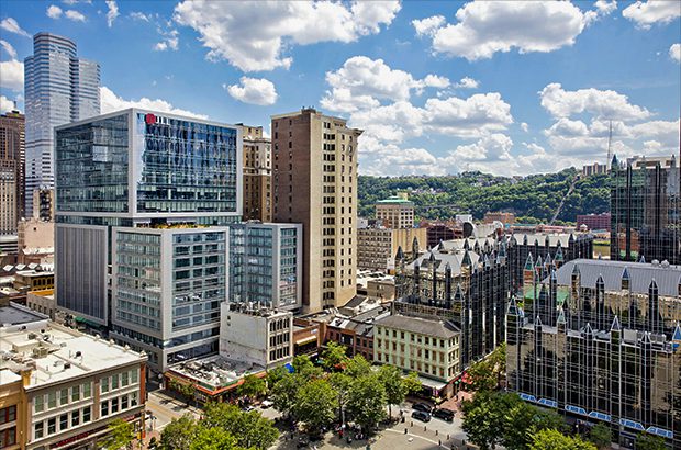 The project has multiple uses that are expressed like a vertical prismatic district. The front volume is suspended over the existing lower buildings and contains the 176-room hotel. The inner portion of the block opens as a sky court. It allows light into the mid-block rooms and presents a monumental urban window to the square. Its garden becomes the view for the rooms around it and functions as an outdoor event space overlooking central Pittsburgh. Below it there is a second thinner volume with the hotel restaurant that also overlooks the square. The gap is occupied by the floor with meeting rooms.