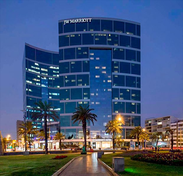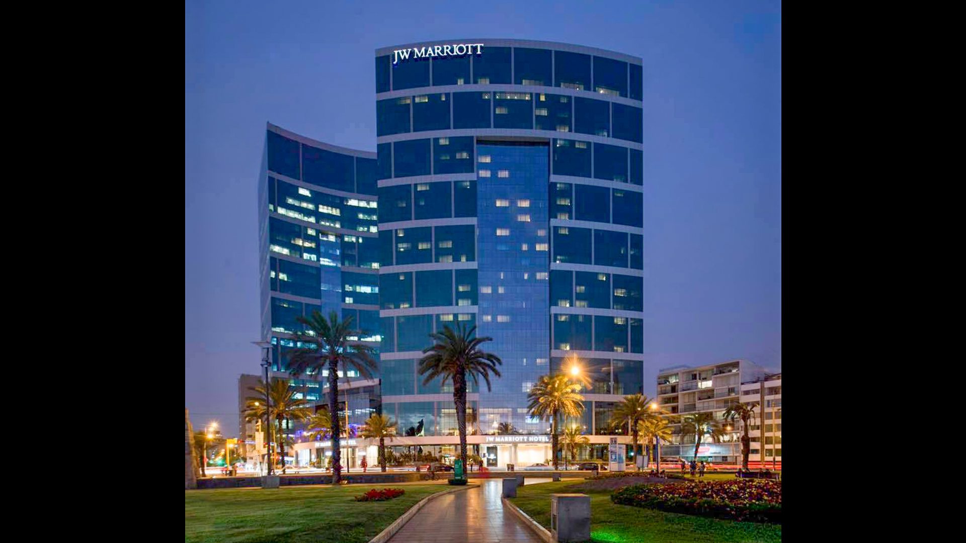 The 5-star, 300-room JW Marriott Convention Center Hotel in Lima are located on an irregular block at the juncture of a major avenue and a park in the district of Miraflores, Lima. The park sits at the edge of the palisade facing the Pacific Ocean. Therefore, the buildings have the combined view of the park and the ocean. Dominating the park frontage is the hotel tower. The guest tower plan fans out towards the ocean with its separated angled sides forming corner windows to the ocean views and its broad frontage curving along a broad arc. A central portion of the arc is recessed in the lower levels, creating the effect of a monumental arch, a giant gateway to the South Pacific.