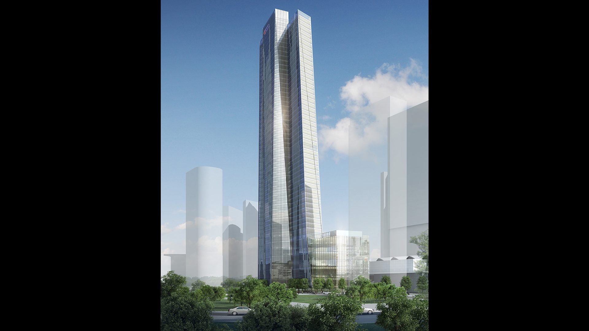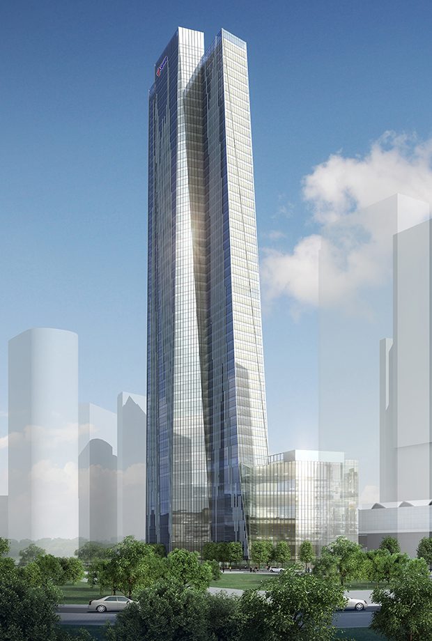 These folds give the building the appearance of being not a single tower, but a cluster of towers, bundled together and sprouting almost botanically from the “trunk” of its podium and the “roots” of the surrounding convention center complex. A further visual link between low-rise and high-rise is an irregular mullion design that traces up the length of the exterior, beginning at the base and tapering away toward the crown in a jagged profile suggestive of a skyline inscribed within the facade of the building (which, of course, is inscribed in turn in the real skyline). With a mixed program of offices, meeting spaces, hotel rooms and more, the building will be a major new amenity as well as a suitably energetic counterweight to the famous twins nearby.