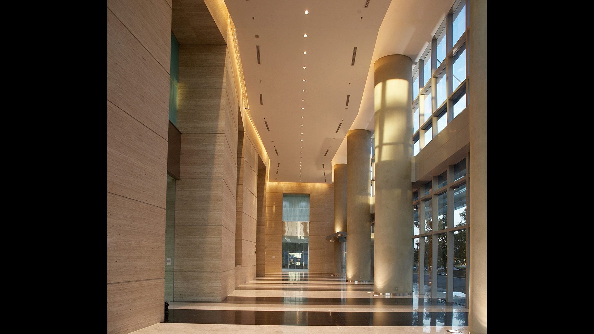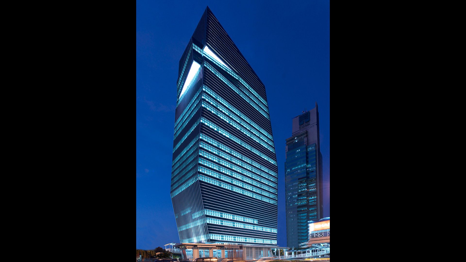 The 26-story commercial office development is located in the prestigious business and embassy district of Jakarta. The project’s signature design is a simple angular form that combines efficiency of floor plate with iconic imagery. The chiseled-diamond form uses a simple curtain wall with a contrasting emphasis of vertical and horizontal mullions to achieve a striking balance of form, while the randomly balanced forms extend to the interiors where natural stone is used in an elegant and spacious lobby.