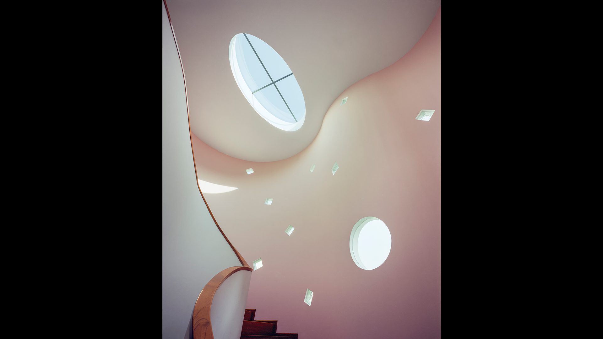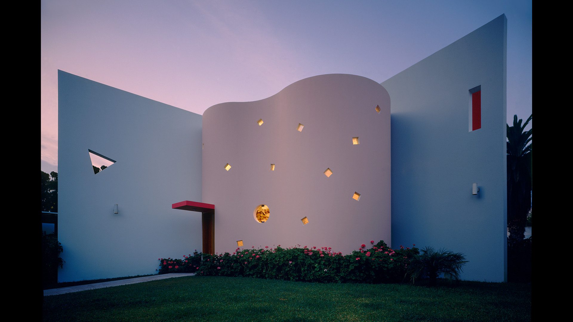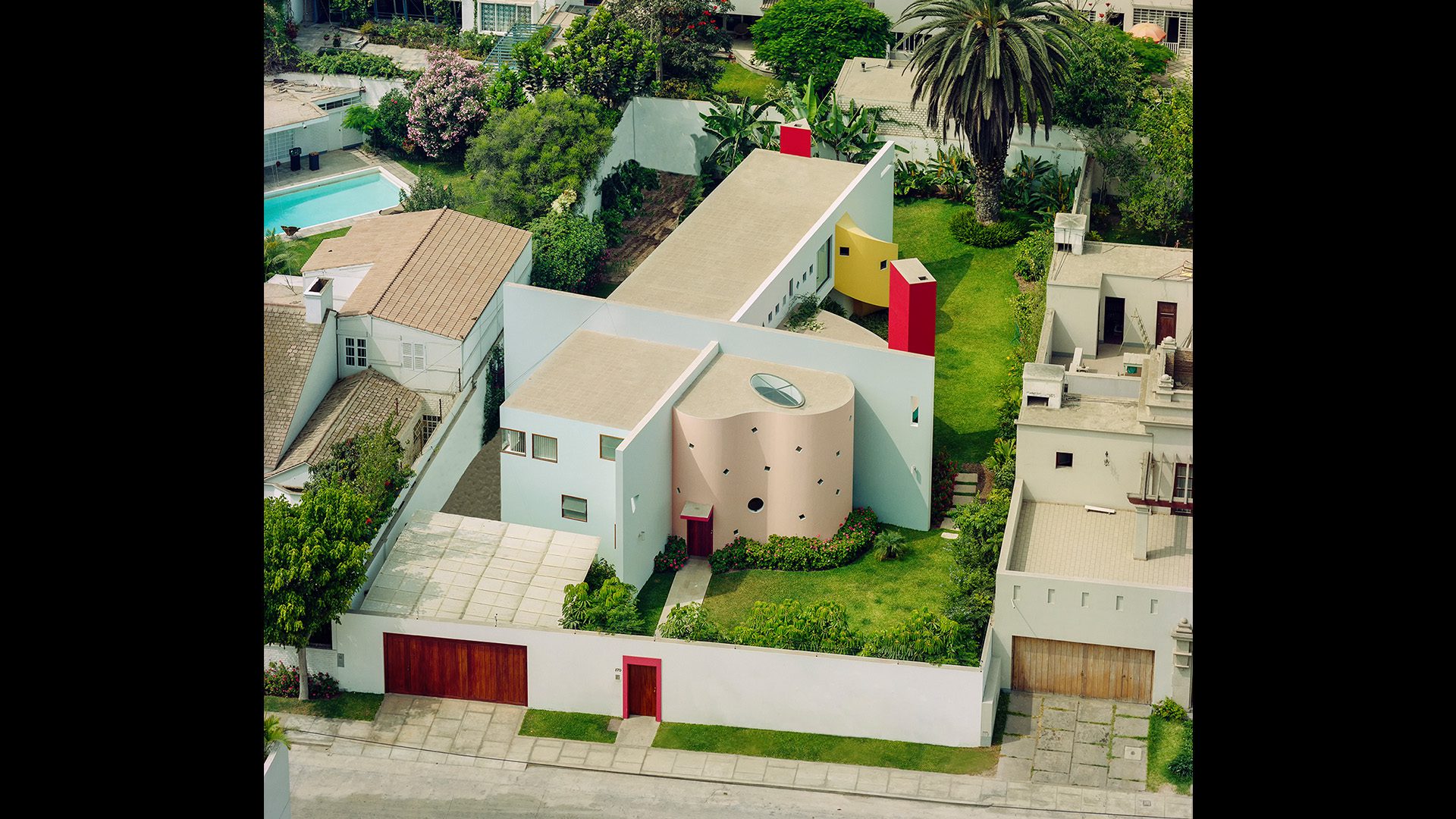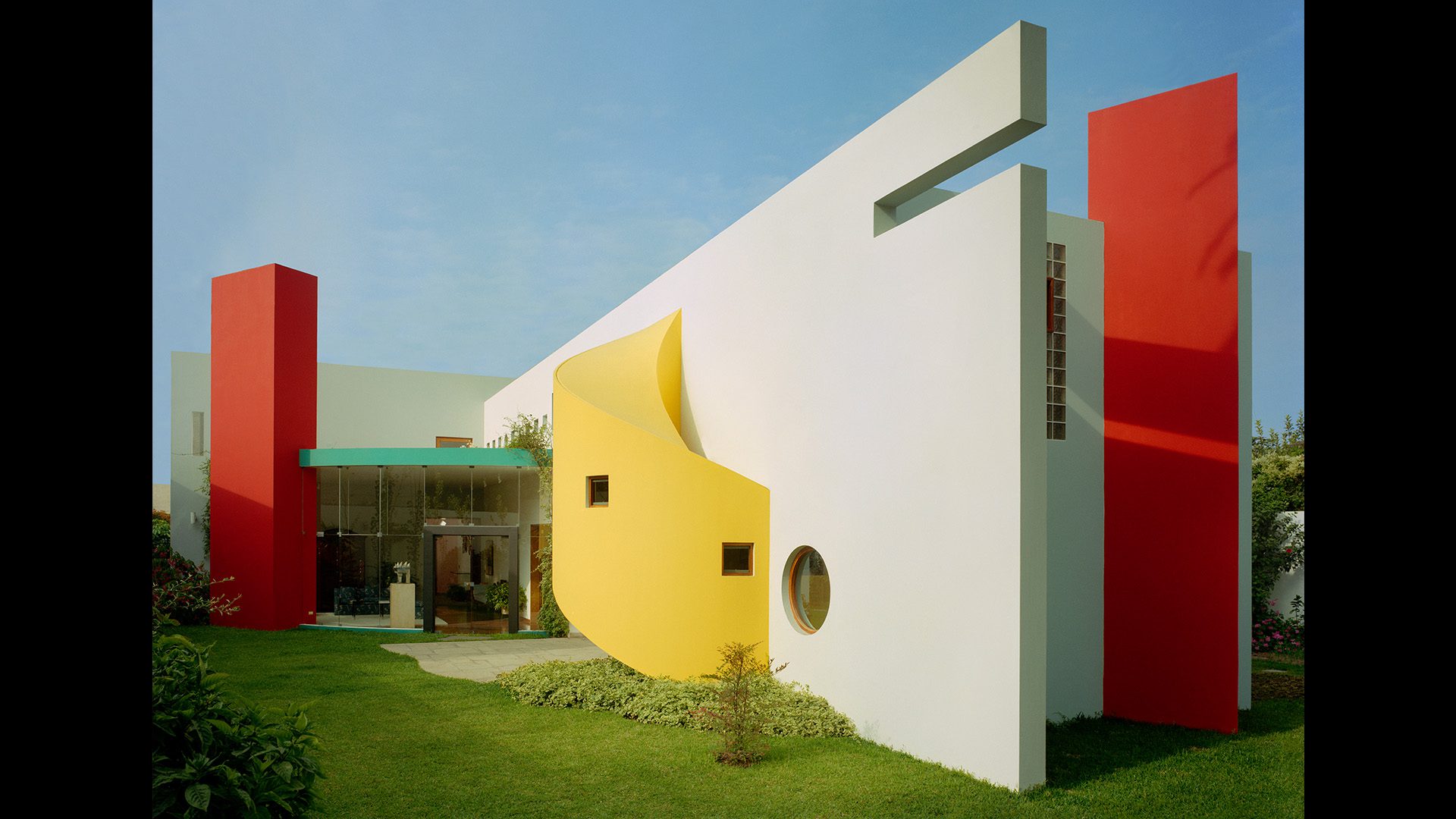 Conceptually this residence, sited in the Andes foothills with a view over the city and the Pacific beyond, is a collection of forms assembled on a neutral base. Each form is symbolic of the program within. The base contains the garage and housekeeper’s bedroom. The kitchen and children’s playroom are located in the functional L-shaped building with strip windows. The dining room is a hedonistic Brazilian curve; its roof a terrace for sculpture. The bedrooms and library are stacked in a tower removed from the activity of daily life. The tower’s roof is an exercise patio and pool. Circulation is articulated in the pink, cross-shaped building which steps up to allow for the stairs.