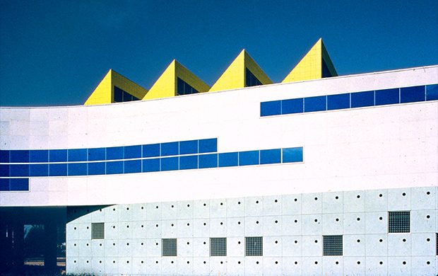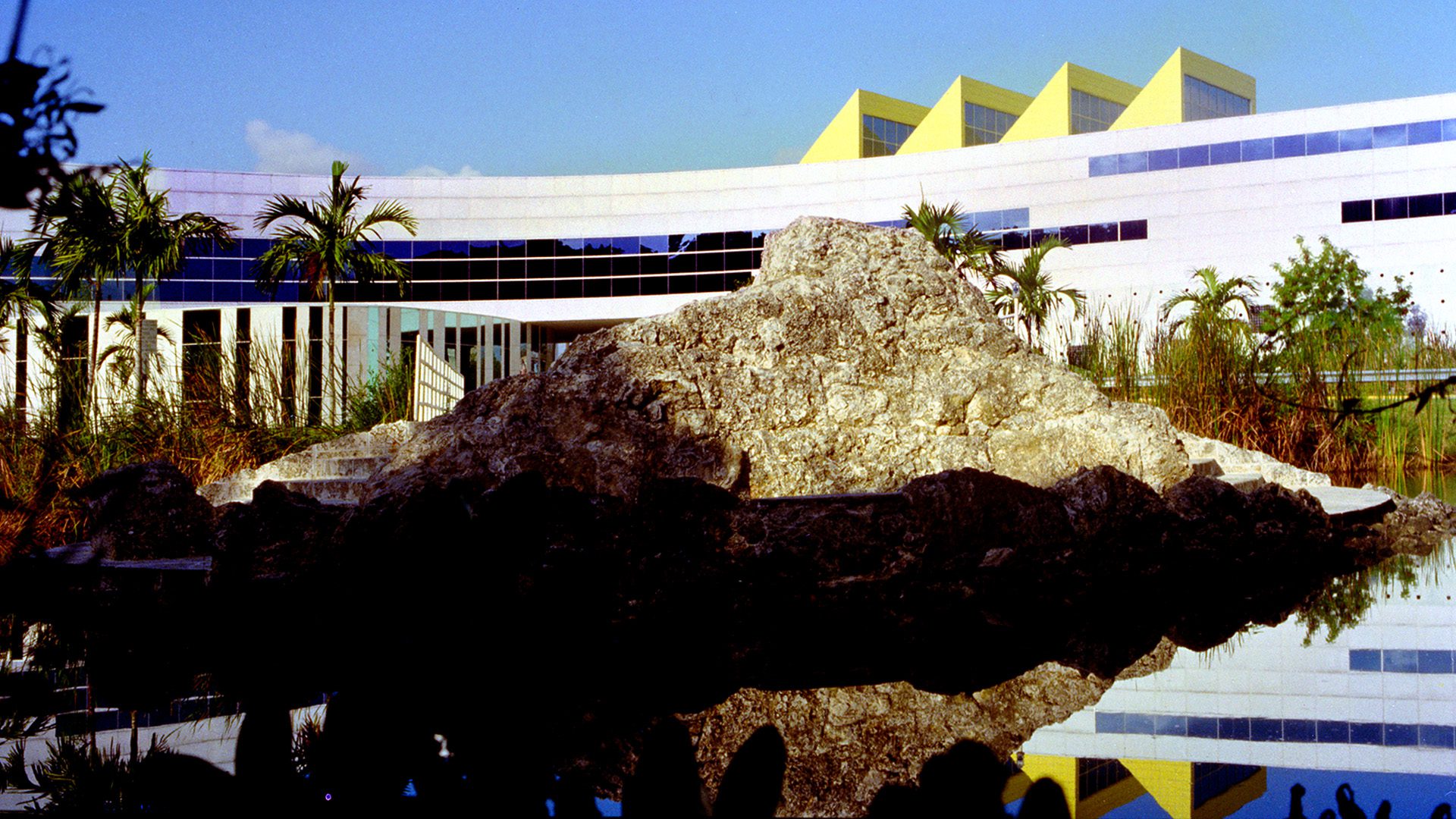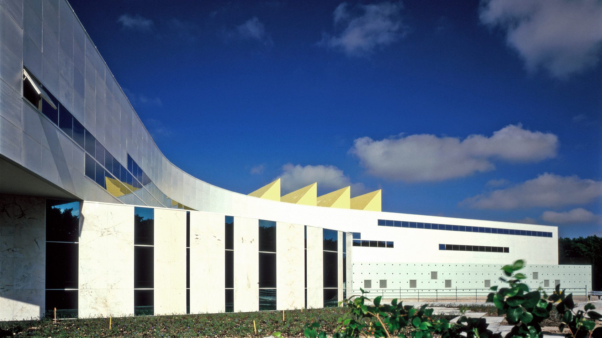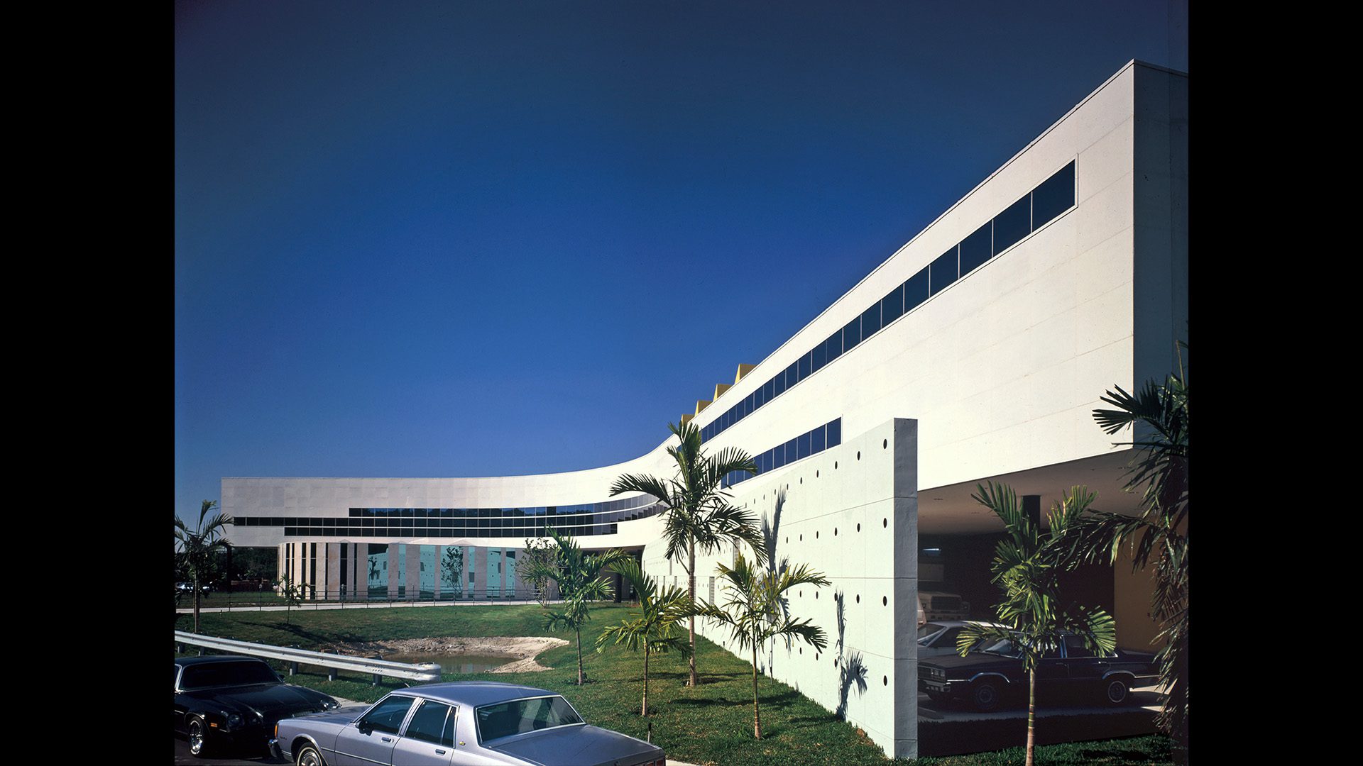 Arquitectonica’s first public building was the North Dade Justice Center which sits on a narrow site between a major highway and an environmental preserve. The main courtroom building is raised allowing transparency from the road to the preserve. The curving courtroom bridging is supported by two forms. One conceals the judges parking and arrival of prisoners; the other, a rounded triangle, contains the entrance to the building and clerk’s office. The resultant breezeway gives equal importance to visitors arriving from the parking lot and to those arriving by public transport.