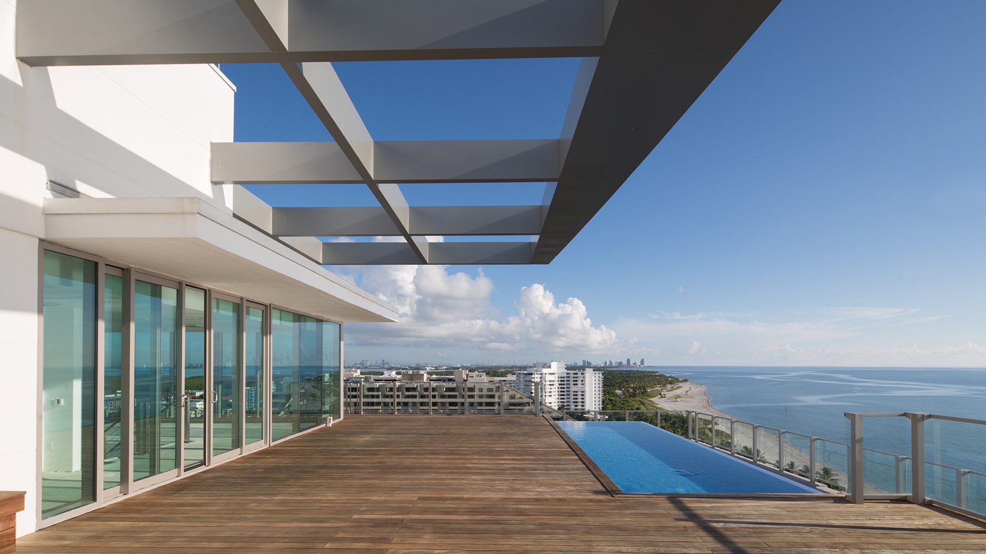 The minimalist architectural expression of the volumes is supported by the purity of the skin. The building perimeter is created by deep balconies with glass rails that follow the gentle curves of the tower facades. The balconies create deep shadows that give depth to the skin. The actual building façade is recessed beyond and is also glass. The intent is to create a light and transparent building. The pool deck has cabanas, a poolside café. The top two floors contain penthouses with rooftop pools and terraces.