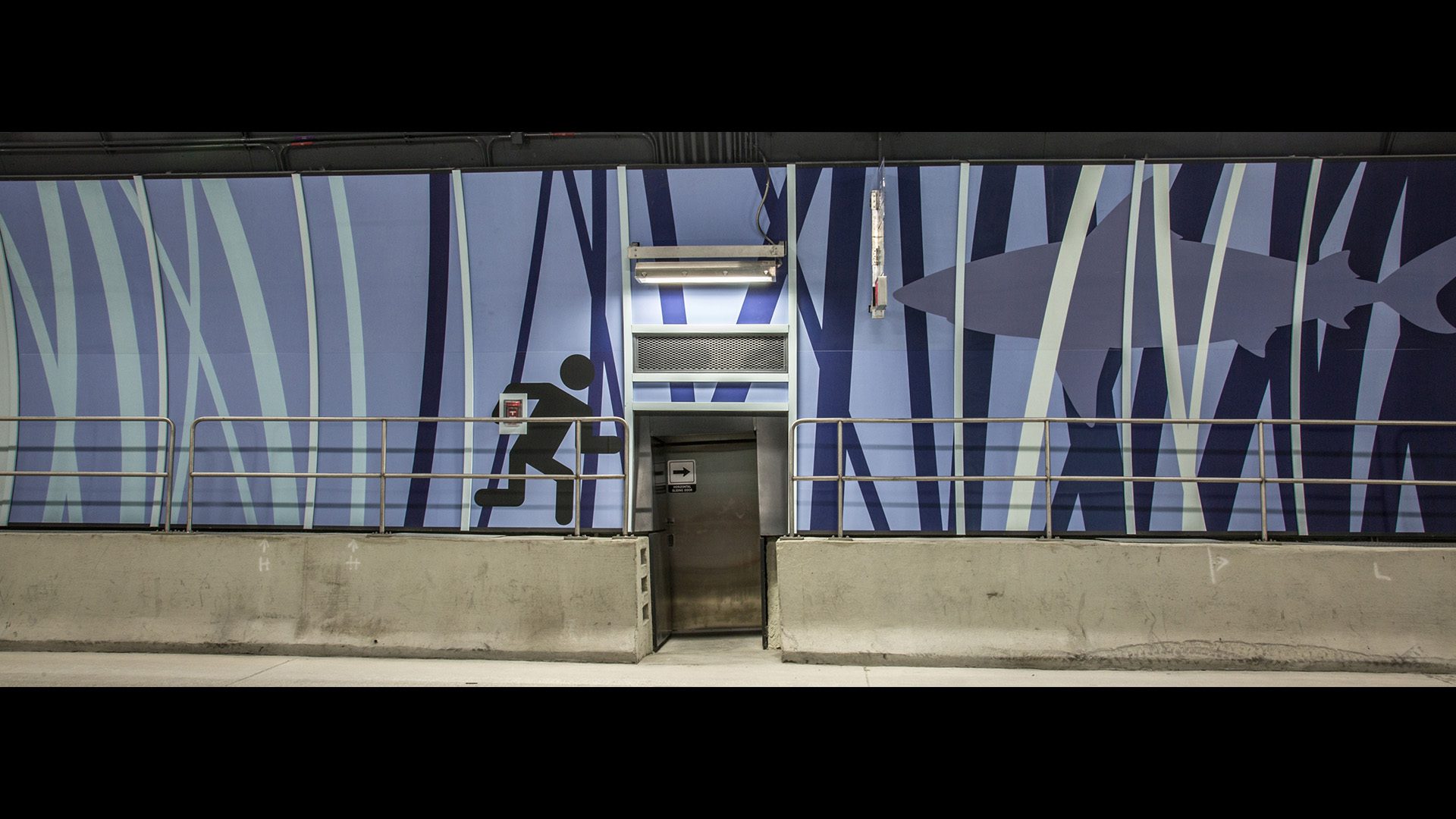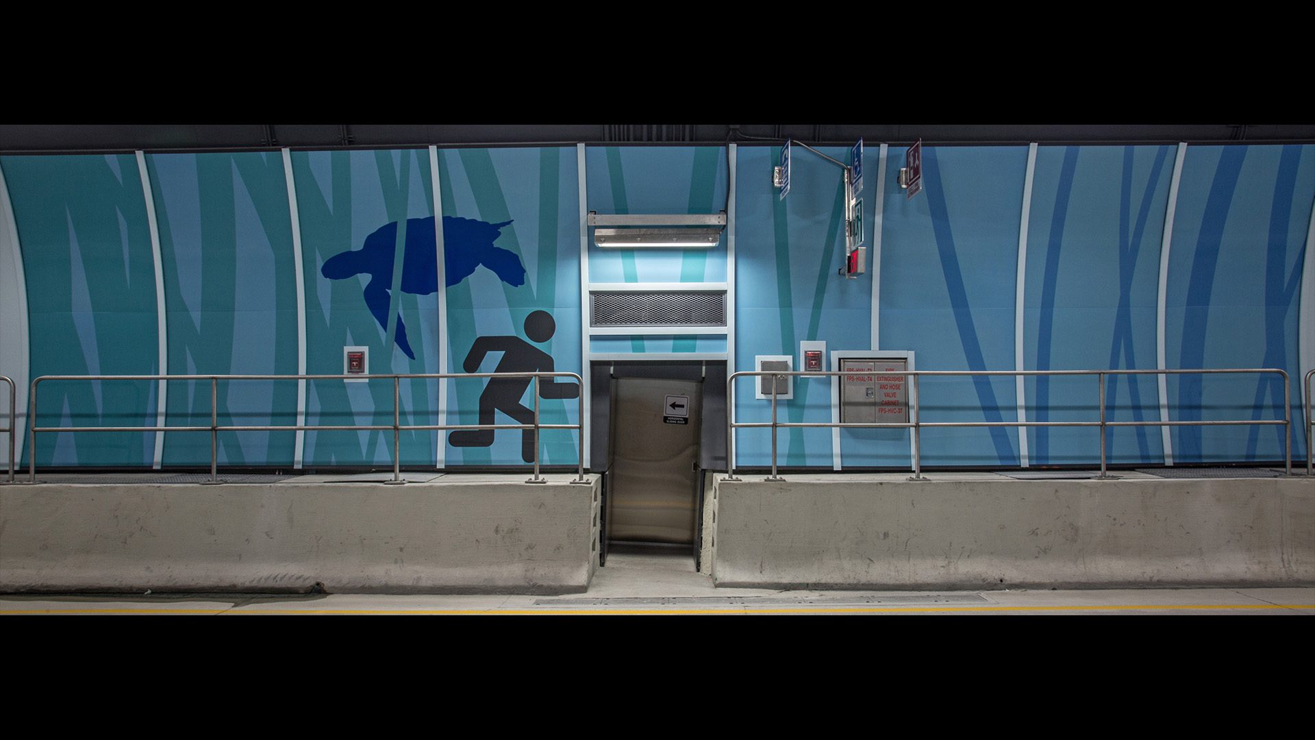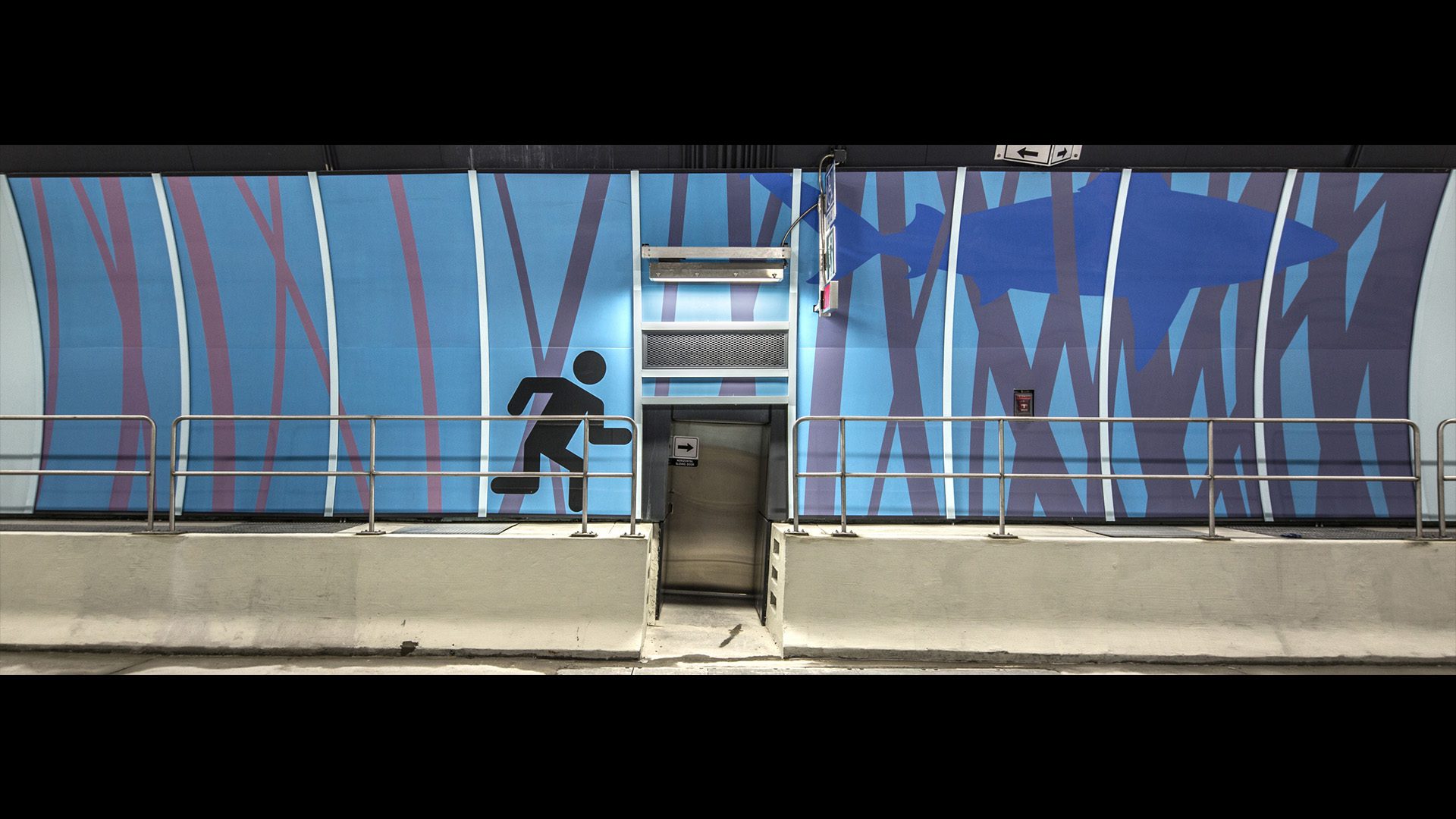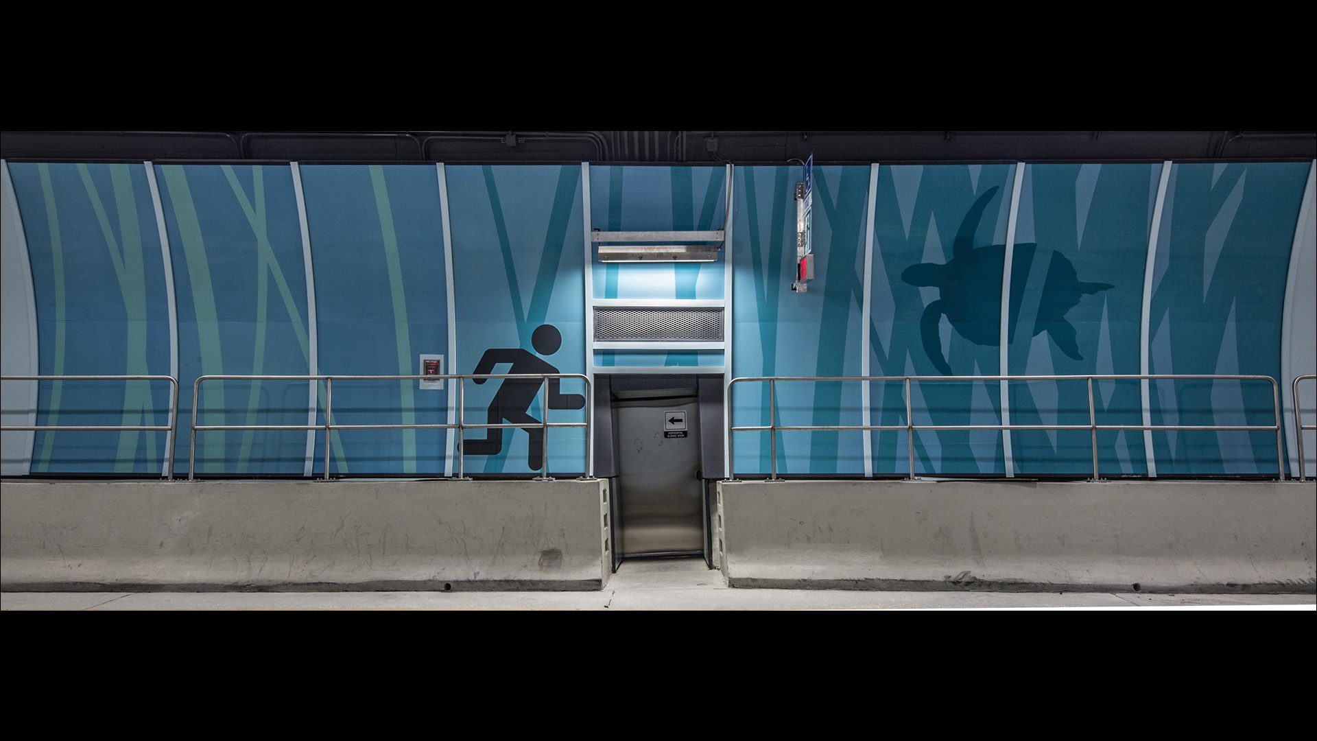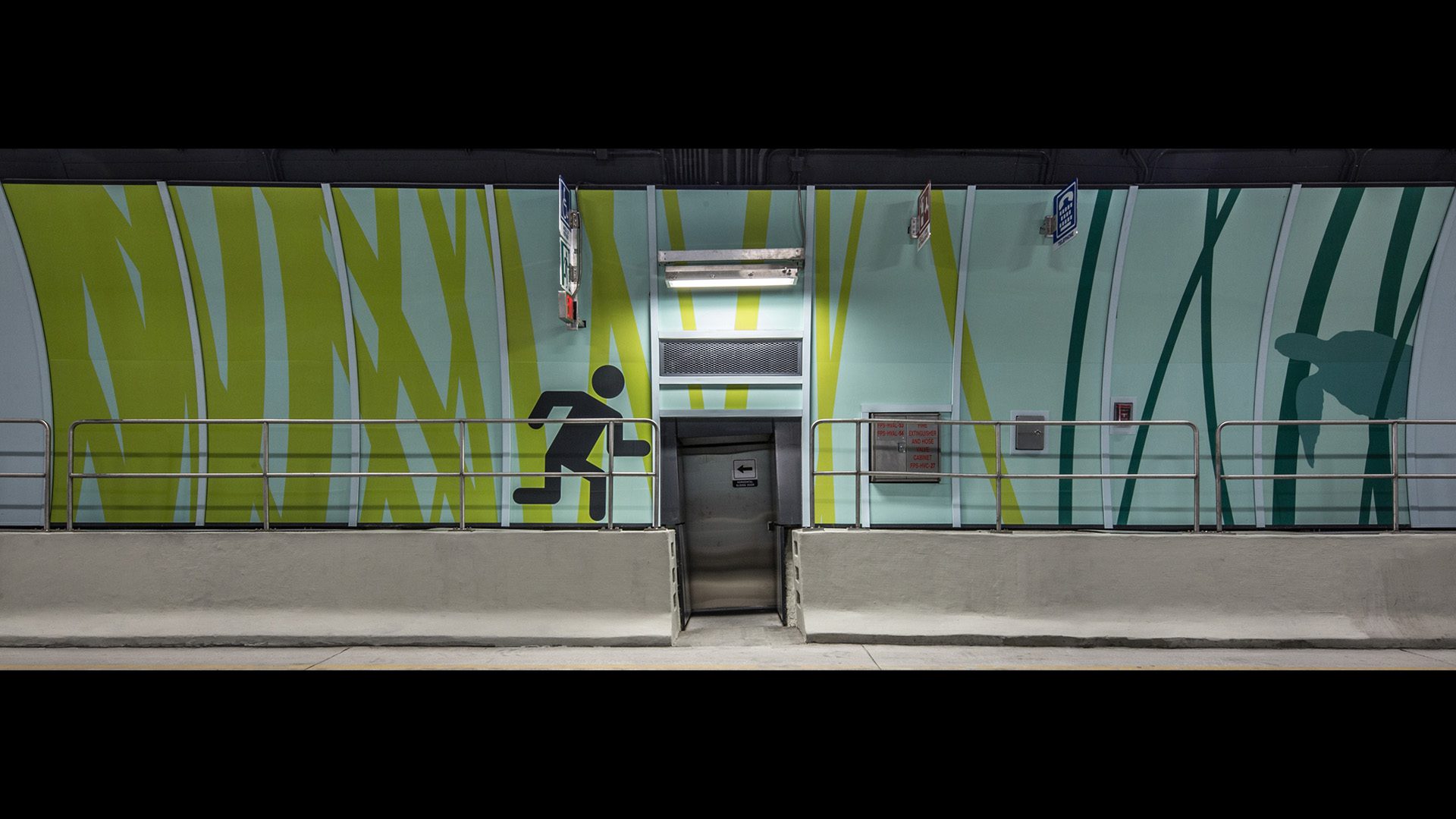 The graphic treatment continues inside, with colorful, cartoonlike murals that depict sharks, swamp grass, and sea turtles in an underwater narrative — a kind of high-speed animation up and down the walls of each tunnel. The shades of aquamarine, purple, green, and yellow grow darker as the roadway dips farther under the water, and then lighten as the roadway rises to the surface again. Running human figures, painted in black, show where the emergency exits are located.