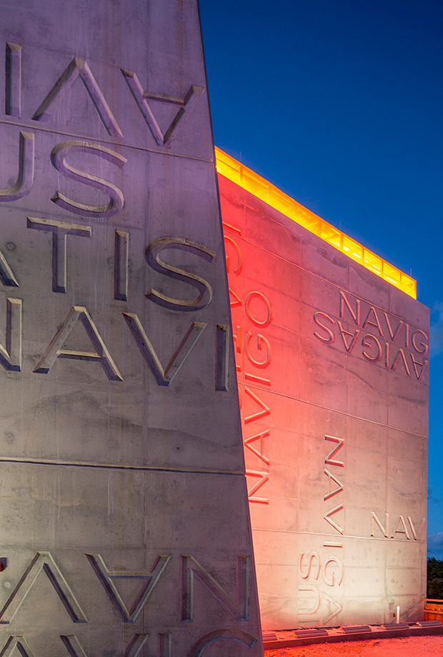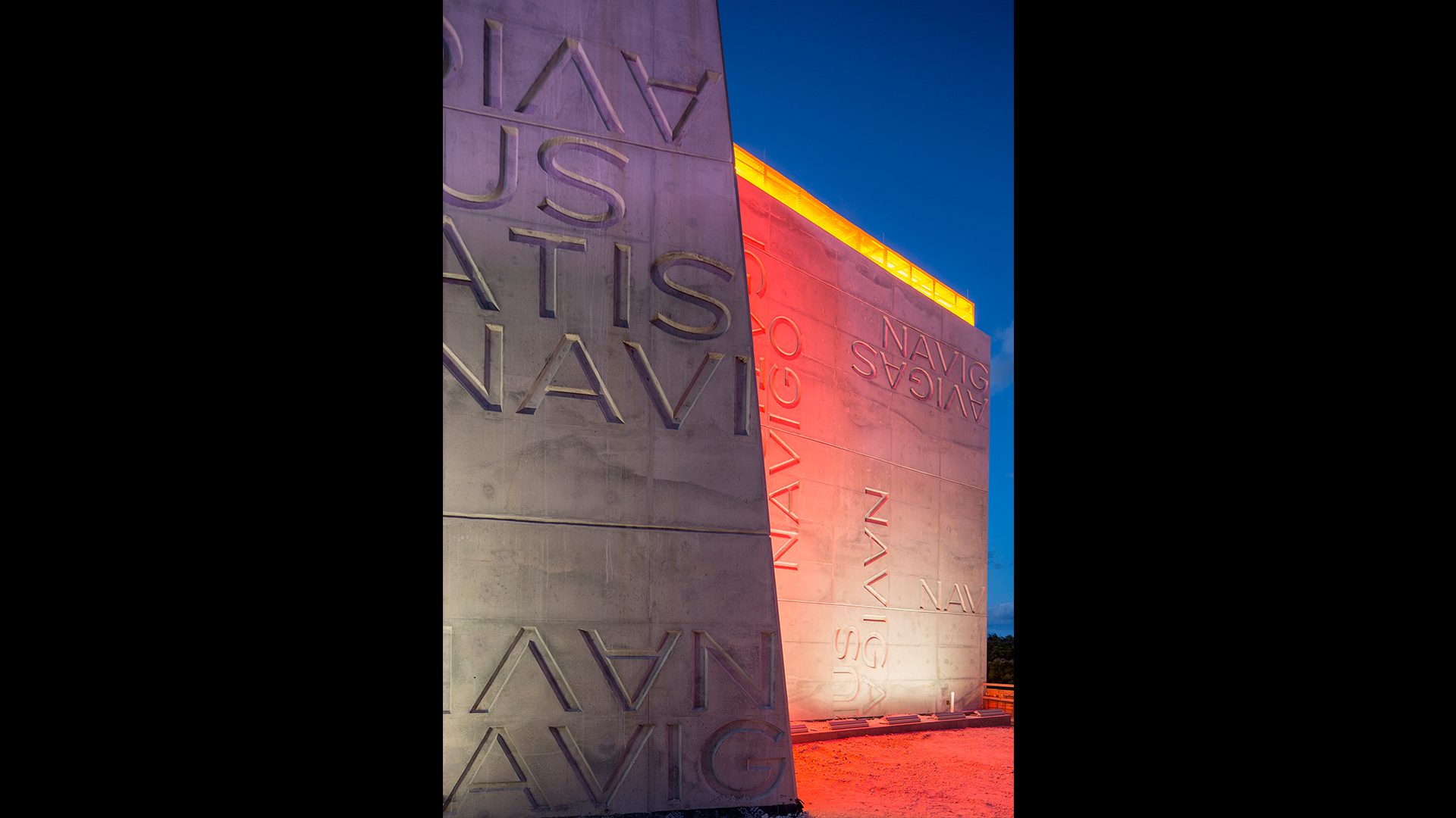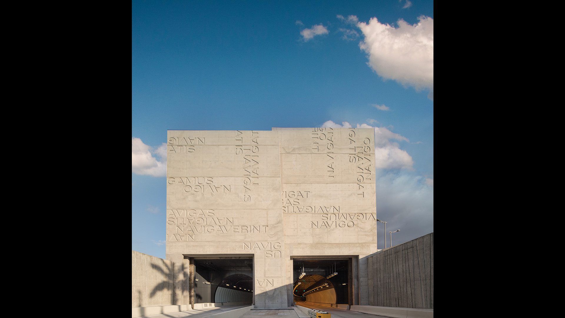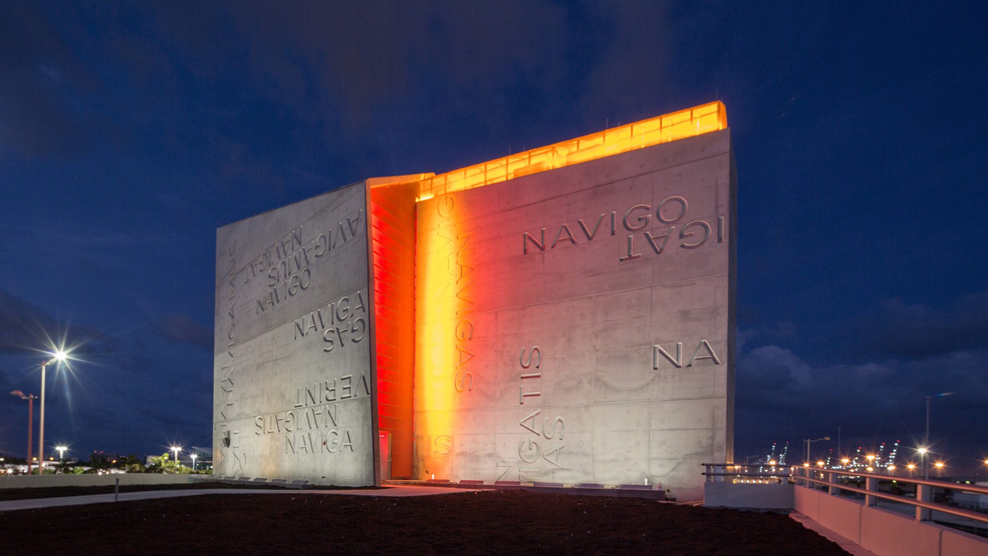Eighty-foot-high portals stand like ancient monoliths midway down the causeway that connects downtown Miami to Miami Beach. The soaring portals are not mere architectural follies, however. They were designed to contain and conceal a set of mechanized floodgates that can be lowered during a hurricane emergency to block the entries to the two 4,200-foot-long tunnels. A graphic treatment of bas-relief lettering breaks up the monotony of the cast-concrete facades with variations of the Latin word for “navigate” — navigo, navigas, and navigatis — and this further underscores the maritime nature of the project. The letters are deeply set into the concrete surface and catch sunlight within their chiseled cavities. The narrow sides of the portals are open to reveal bands of orange metal mesh and are back lit to create the impression of volcanic action splitting the portals from within. At night, the openings cast an enigmatic orange glow across the concrete facades.