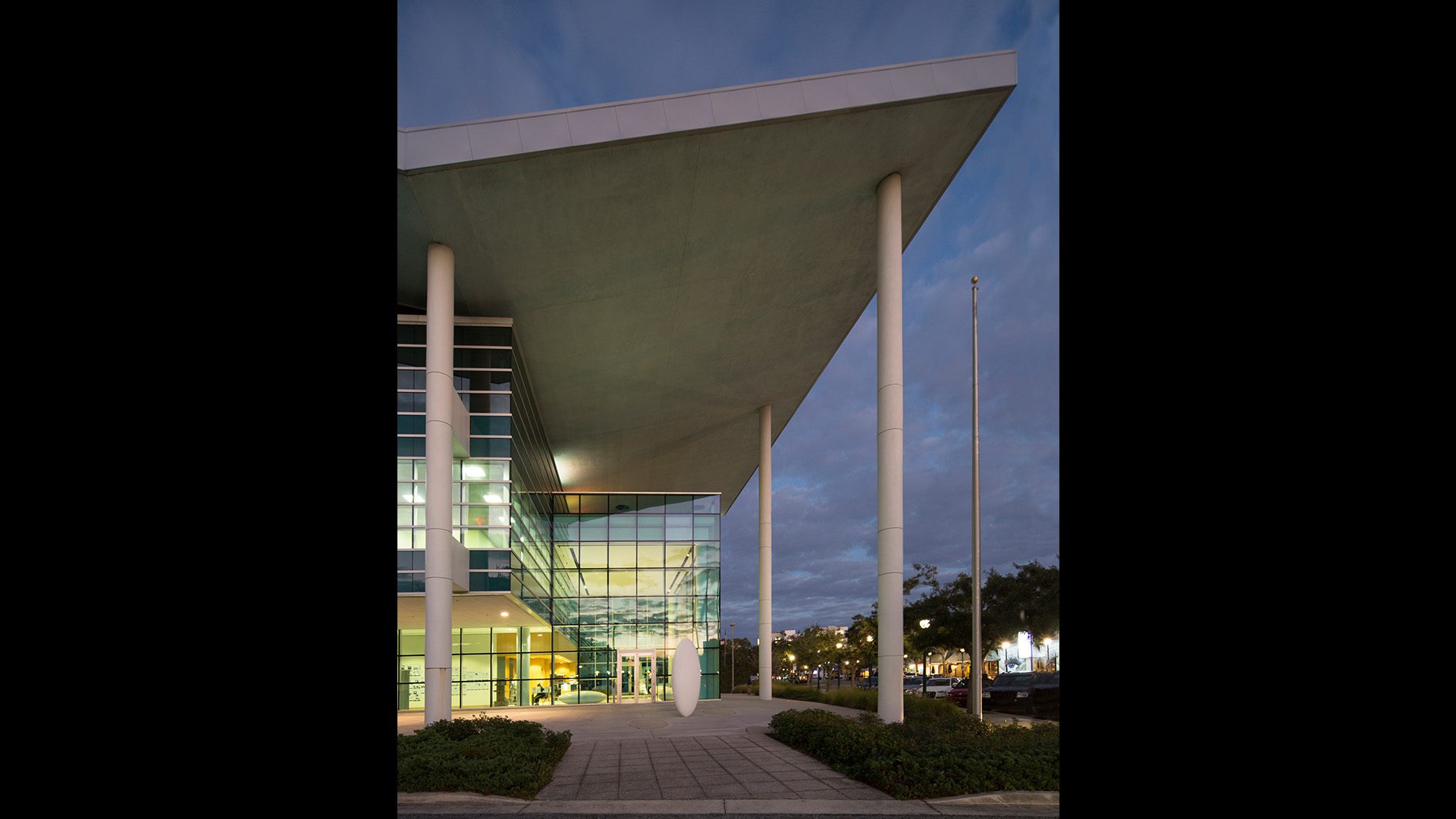 To give the structure the “open airy feel” the building is placed beneath what appears to be a stand-alone roof – an undulating folded plane floating above ground on support columns. This structure becomes a giant overhang protecting the building and forming a covered plaza for the entrance lobby/exhibit space that is housed within a two-story glass cube viewable by pedestrians. The two floors of offices are housed within a large rectangular glass box that rests on pilotis suspended one-story above ground. Depending on the angle and view, the glass box appears to float suspended from the roof. The elevated offices are thus protected from ground level flooding during hurricanes. The glass is banded horizontally and vertically -a subliminal reminder of the overhangs and louvers on landmark buildings in the area. The offices have flexible floor plans allowing for change mandated by technological innovations. The employee cafeteria, sited on top above the entrance, adjoins a covered terrace that provides a dramatic space for staging community events.