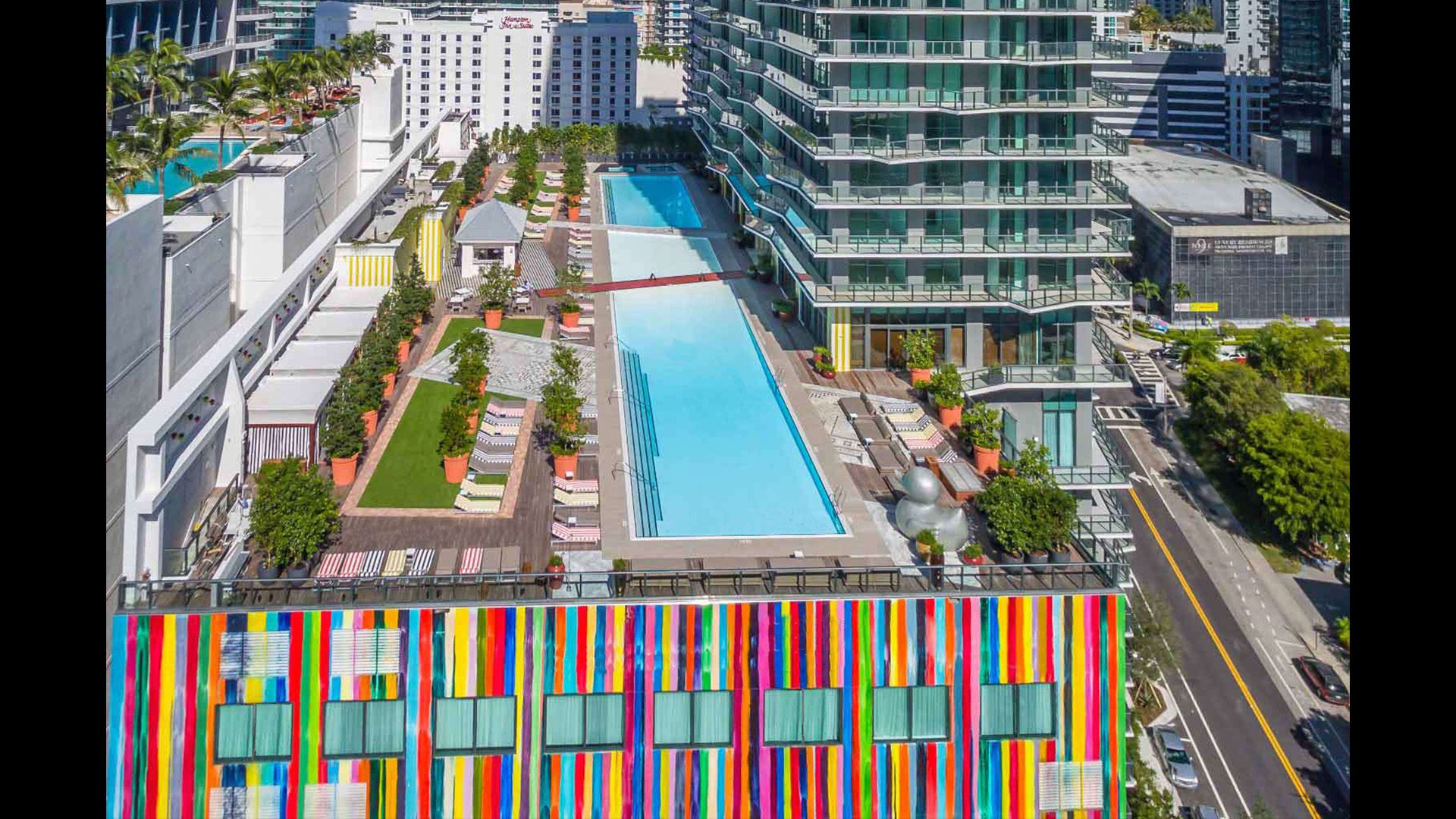 The hotel occupies the first 10 floors with the condominium residences, which range from 600 to 1,600 square feet, above. sbe Hotel Group brings a collection of retail, spa and food and beverage concepts to the hotel including 5,000 square feet of meeting space, two fine dining restaurants, a spa and two pools. The hotel amenities are also available to the condominium residents. The project has been designed to attain LEED Sliver status. The SLS hotel opened in October 2016. The hotel and retail/restaurant space line the majority of the parking garage, with the remaining garage facades adorned by a massive mural by artist Markus Linnenbrook.