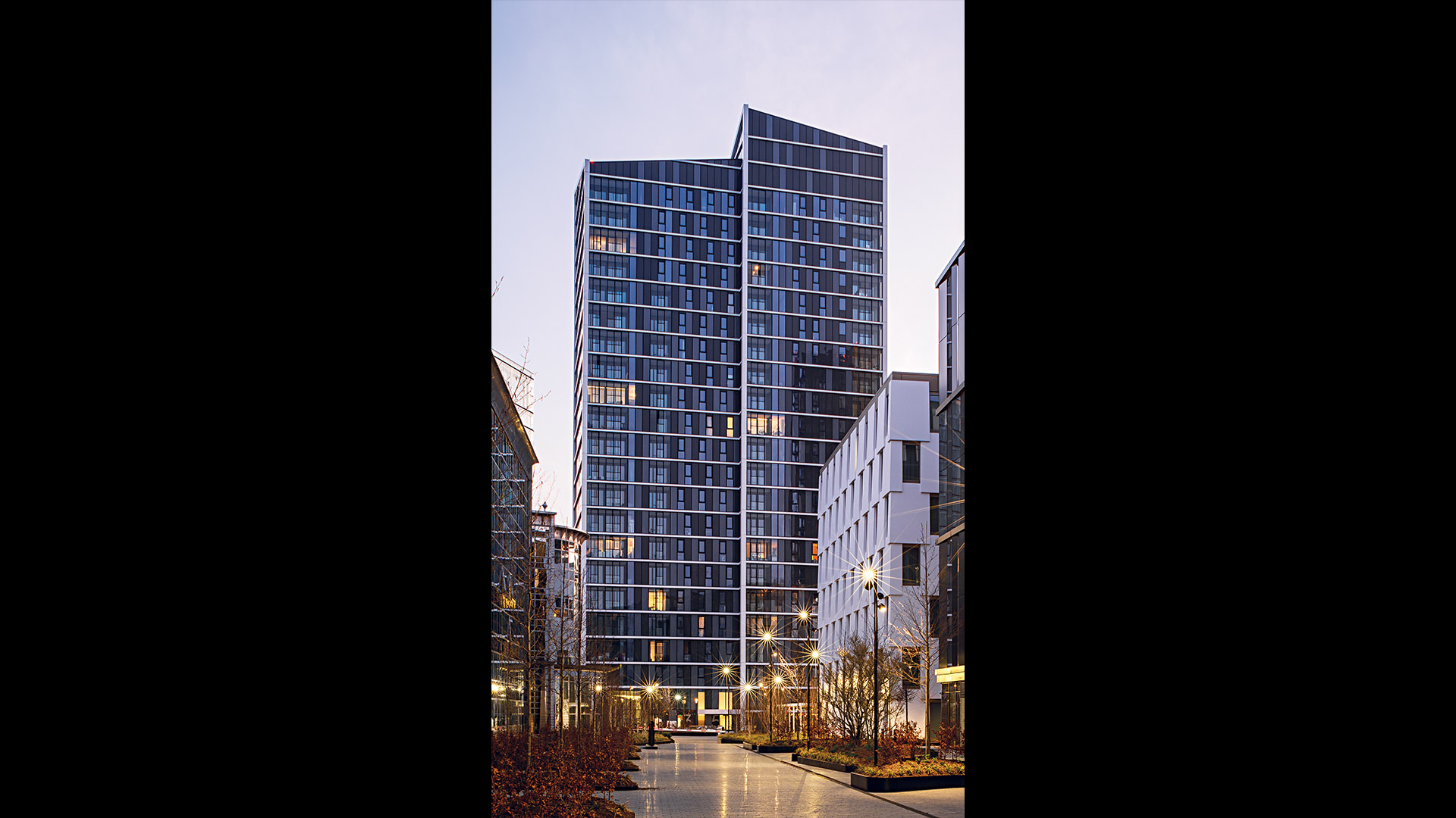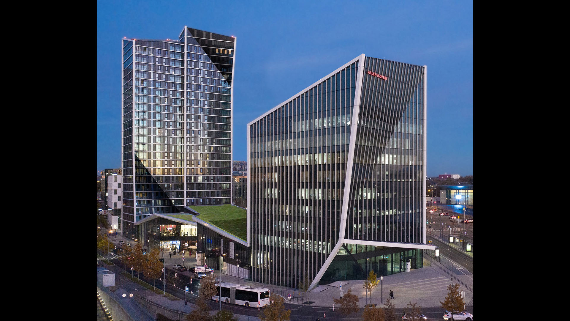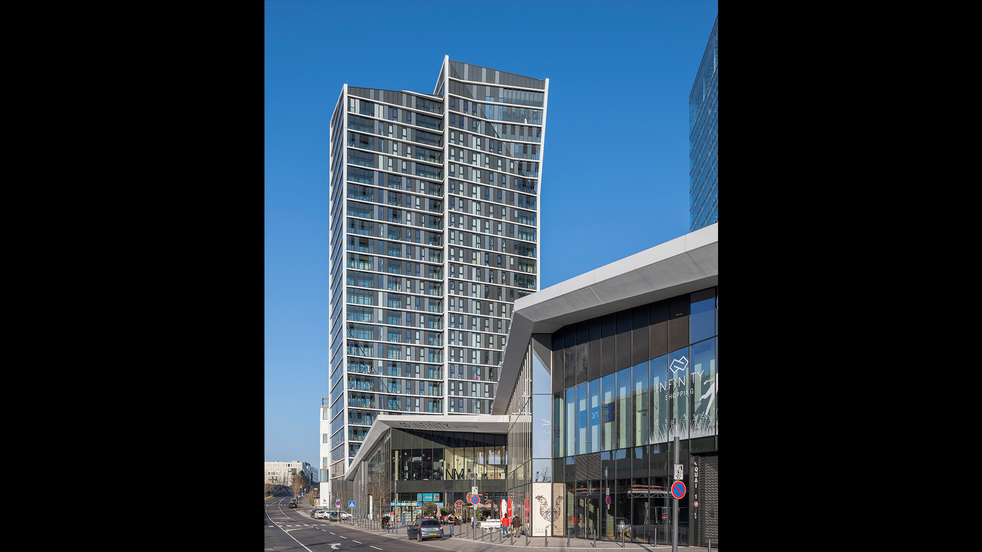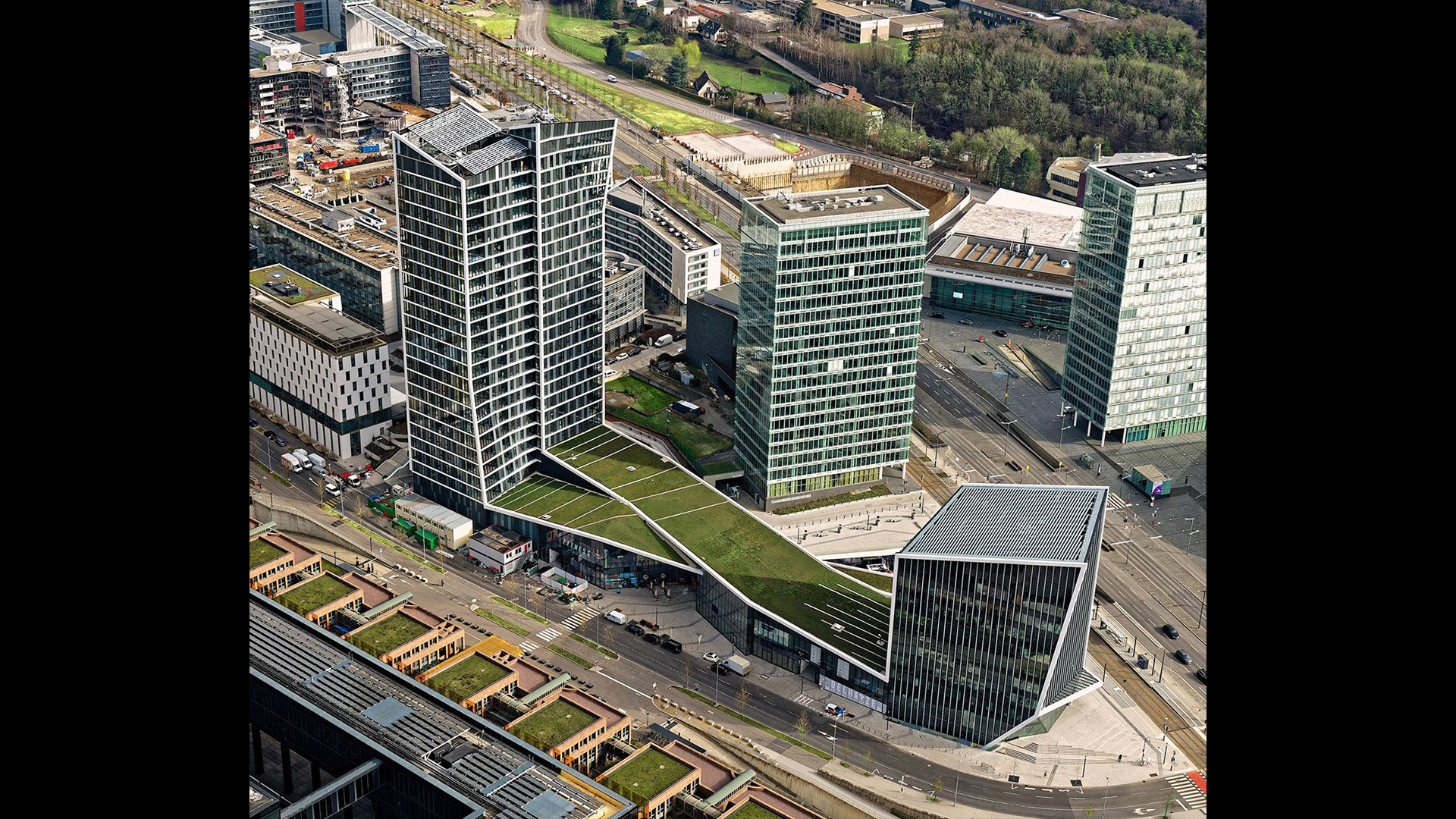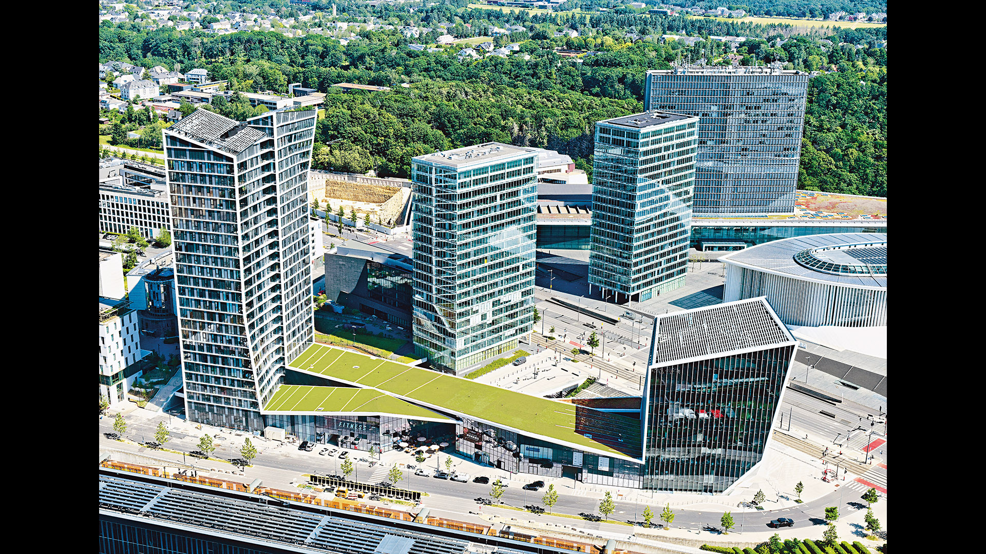 Already home to several EU office buildings, the area is now becoming a major business district, and Arquitectonica’s mixed-use complex will help make it a fully functioning 24-hour urban center. Comprising of a residential block and a shorter office block, the scheme highlights the unique connection of the two main components — a glazed public corridor, topped with a pair of green roofs that crisscross in a dynamic figure eight. Creating a fluid passage through the complex, the lofted park also provides shelter for a small plaza to the south, protecting it from the occasionally severe winds blowing off the nearby Alzette River. The adjoining buildings, meanwhile, take up the entwined geometry of the connector between them: the west-facing facade of the office block, which greets Luxembourgers as they approach the area, crimps in the middle and is cut by a diagonal marquee, anticipating the X of the corridor; the residential slab is organized as a pair of conjoined twins, each linking directly to one or the other of the landscaped strips.
