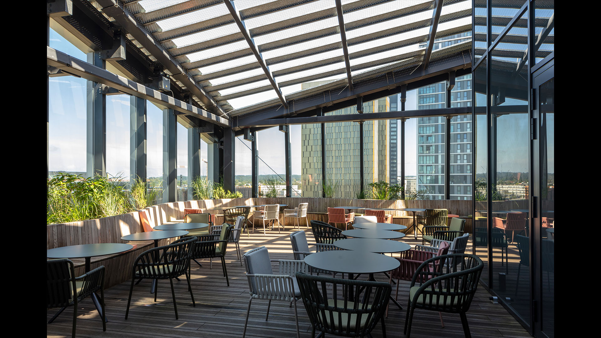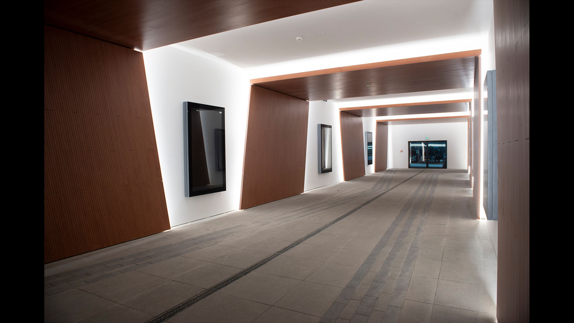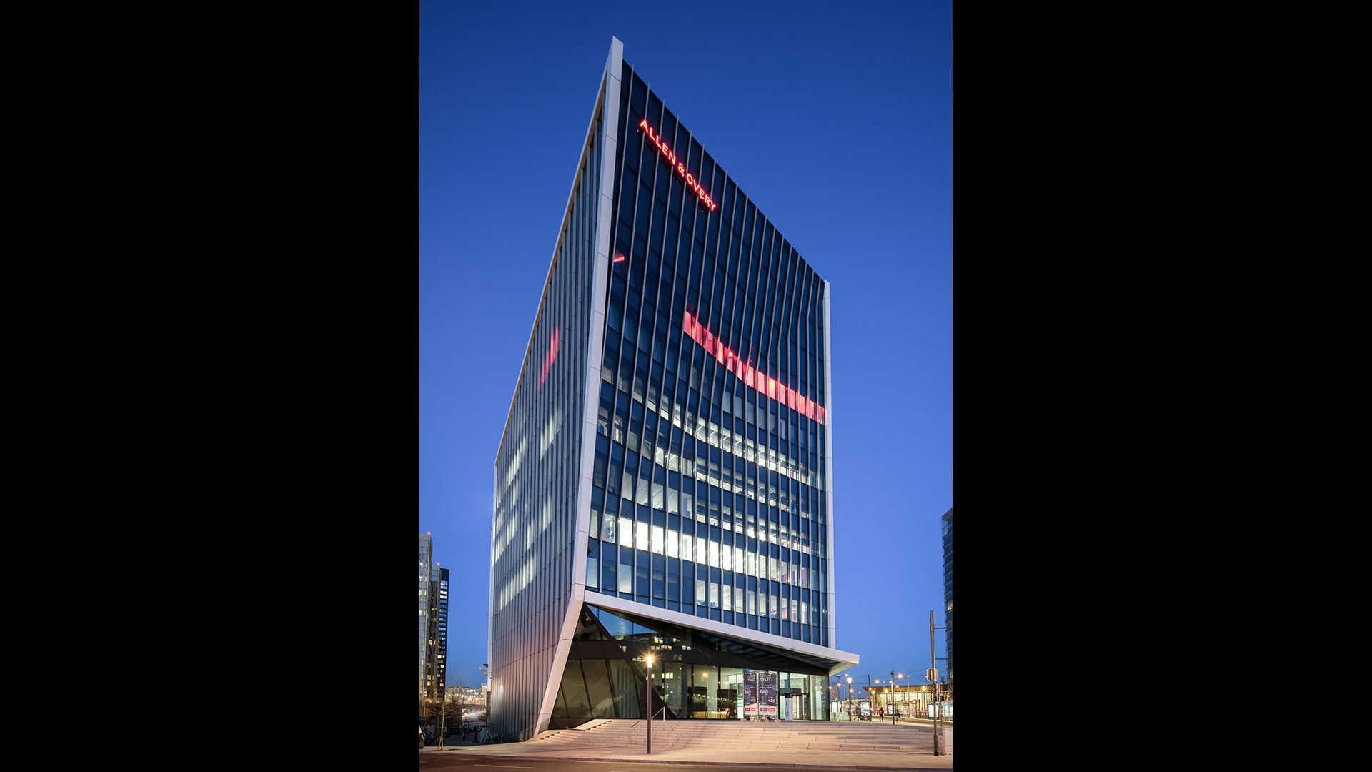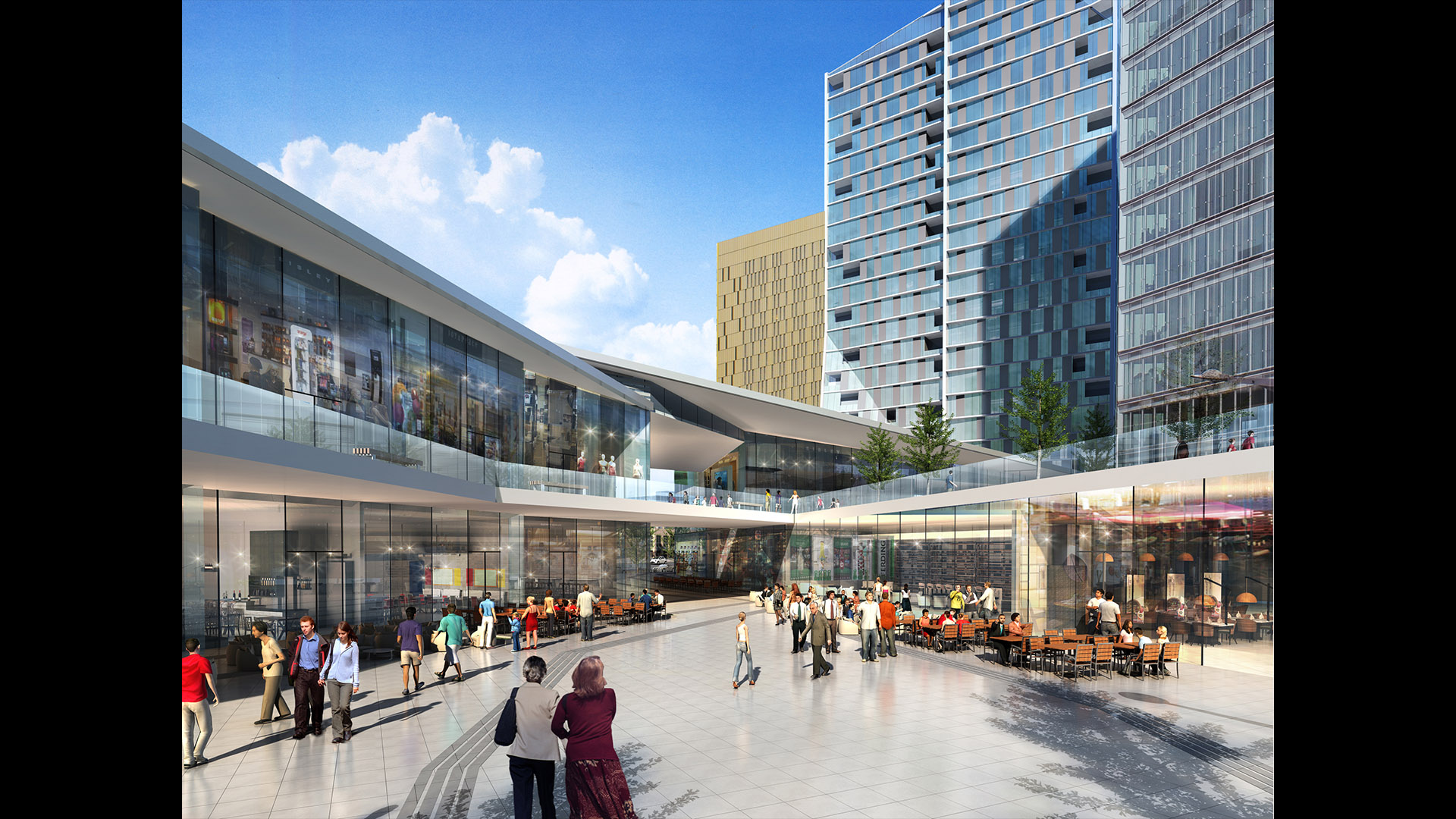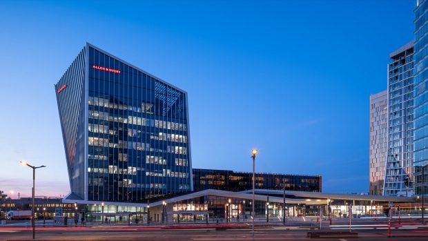 Already home to several EU office buildings, the area is now becoming a major business district, and Arquitectonica’s mixed-use complex will help make it a fully functioning 24-hour urban center. Comprising of a residential block and a shorter office block, the scheme highlights the unique connection of the two main components — a glazed public corridor, topped with a pair of green roofs that crisscross in a dynamic figure eight. Creating a fluid passage through the complex, the lofted park also provides shelter for a small plaza to the south, protecting it from the occasionally severe winds blowing off the nearby Alzette River. The adjoining buildings, meanwhile, take up the entwined geometry of the connector between them: the west-facing facade of the office block, which greets Luxembourgers as they approach the area, crimps in the middle and is cut by a diagonal marquee, anticipating the X of the corridor; the residential slab is organized as a pair of conjoined twins, each linking directly to one or the other of the landscaped strips.