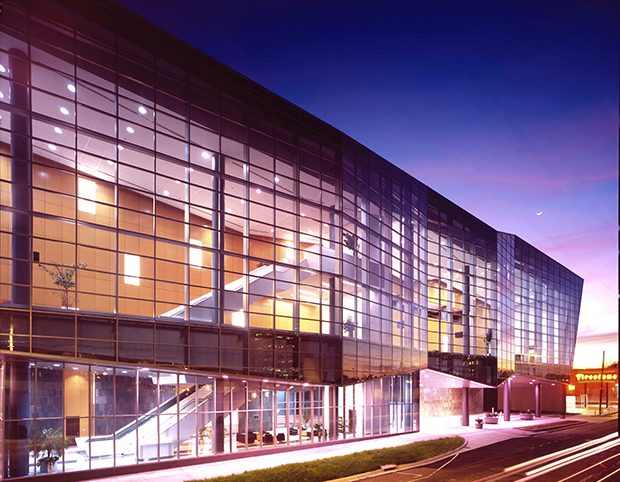 Arquitectonica designed the building as suspended above the plaza as if challenging gravity. Its folding glass facade faces north towards Farish. Its transparency reveals the gallery within and the meeting rooms beyond, telling the story of its functions and projecting its activities to the public spaces around it. Both roof and underside accentuate the building form and reinforce the notion of a chiseled prism suspended in space. Transparency from the street and natural light are very important factors in the design of this complex. As can be seen in the folding glass façade of the center, because of its inherent reflectivity, glass creates a sort of prismatic appearance in the façade as it reflects in different directions – light and shadow, sky and ground, surrounding buildings. The Jackson Convention Center East and West phases have been designed to complement each other and together form a unified composition that makes a bold statement for that entire block.