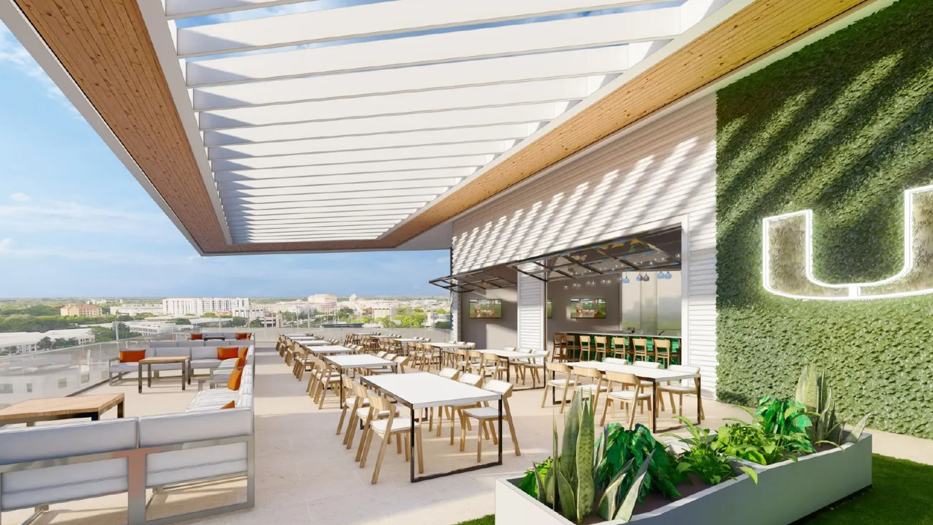 The latest technology and equipment for training and recovery include a treadmill pool, lane pool, hydrotherapy and a hyperbaric room. Other player amenities include a meditation room, gaming lounge and rooms for Podcasting. A special feature of the facility is the “Hurricane Room” which is a 360-degree LED immersive space highlighting the history and traditions of the Hurricane football program. A 150-seat player dining facility is housed in a separate building and is connected to the operation center by a covered plaza.