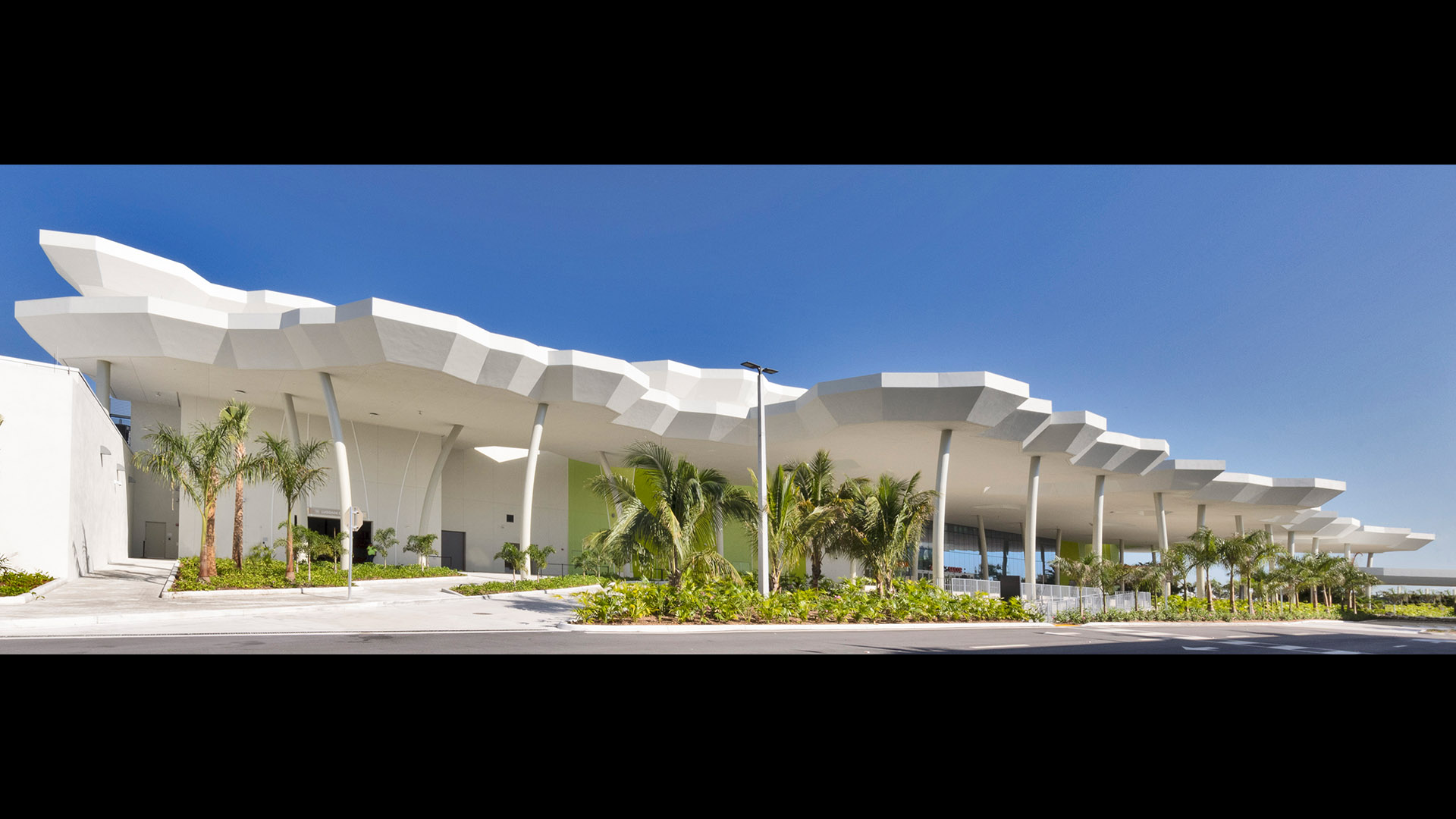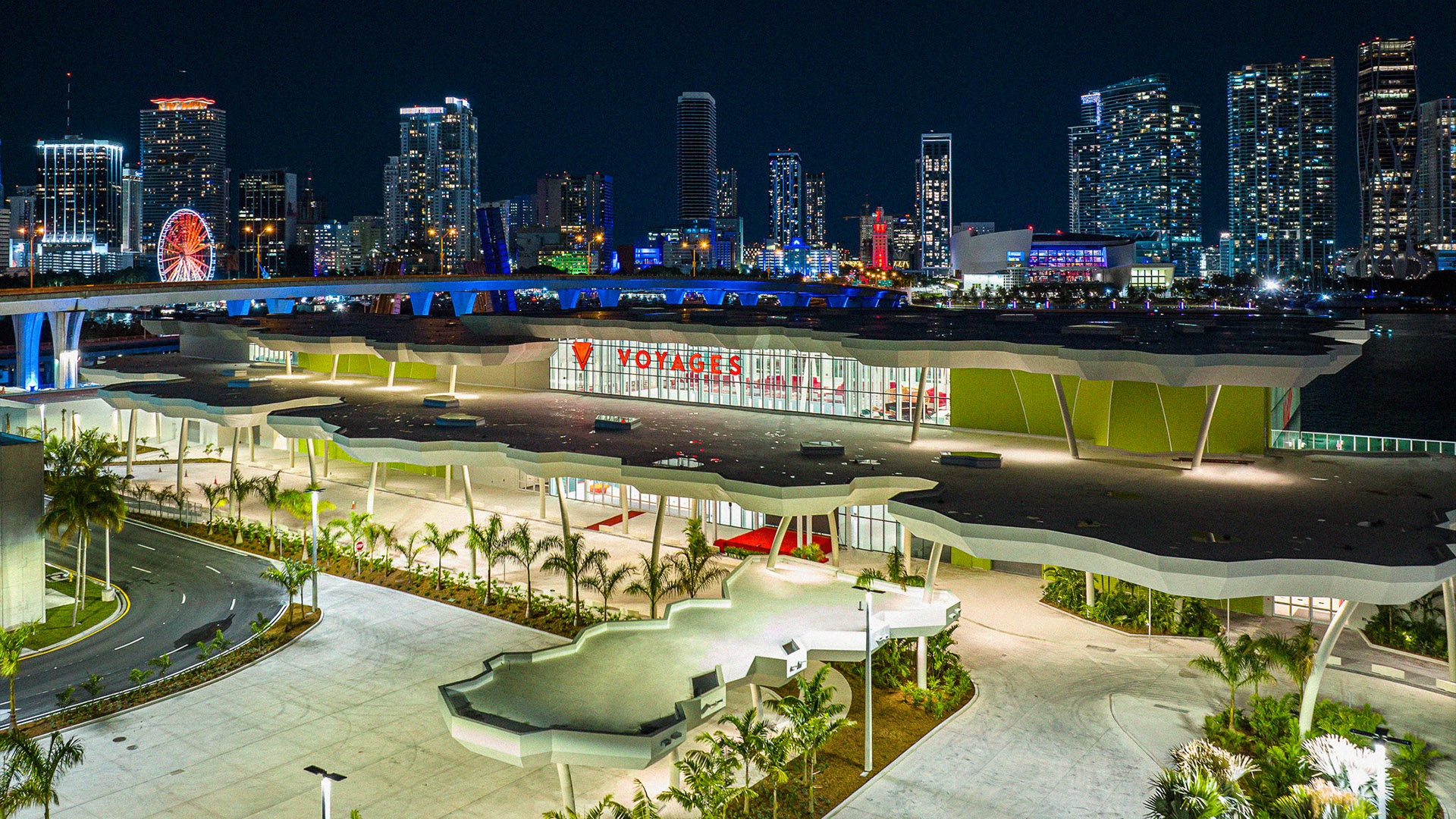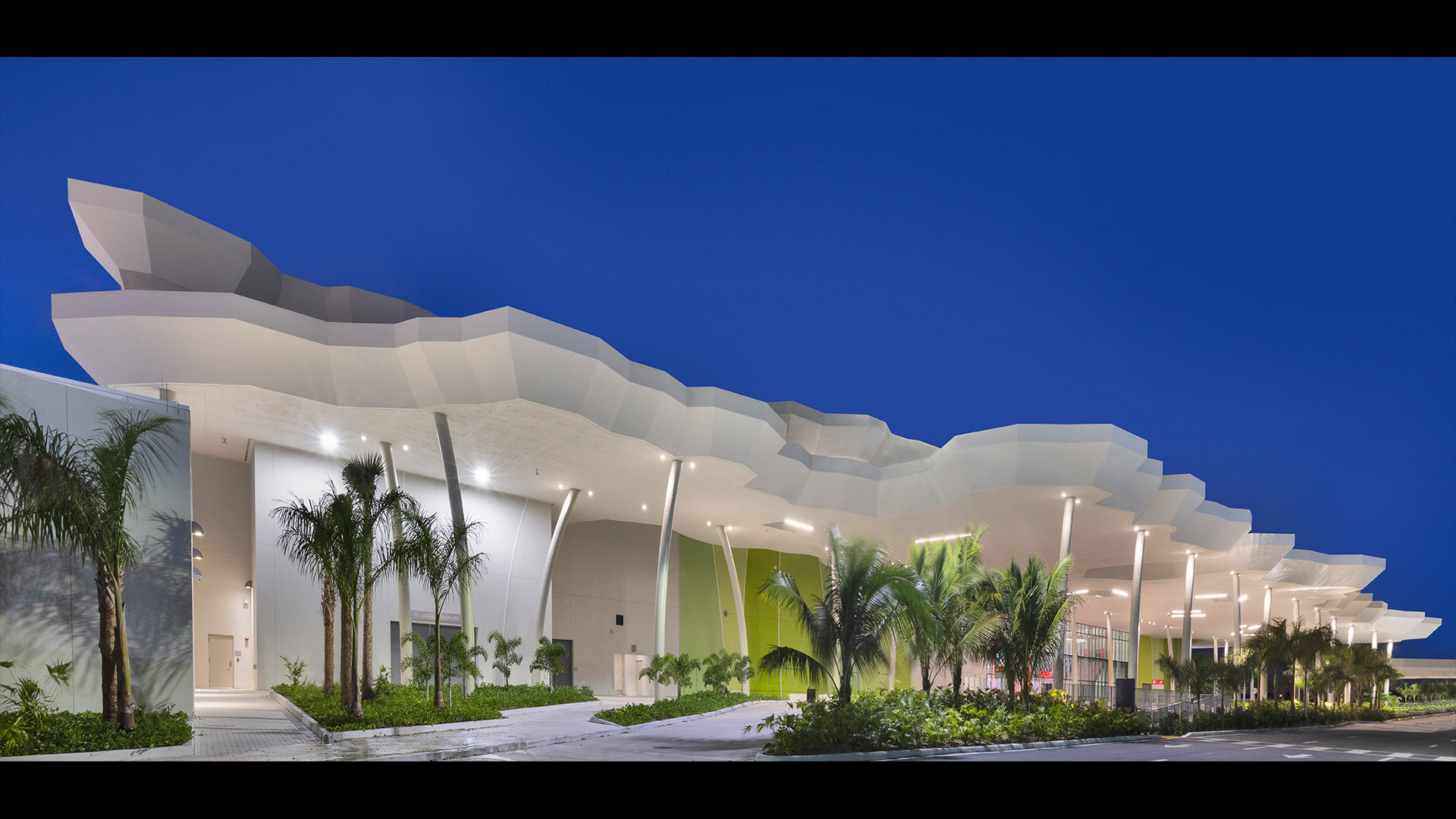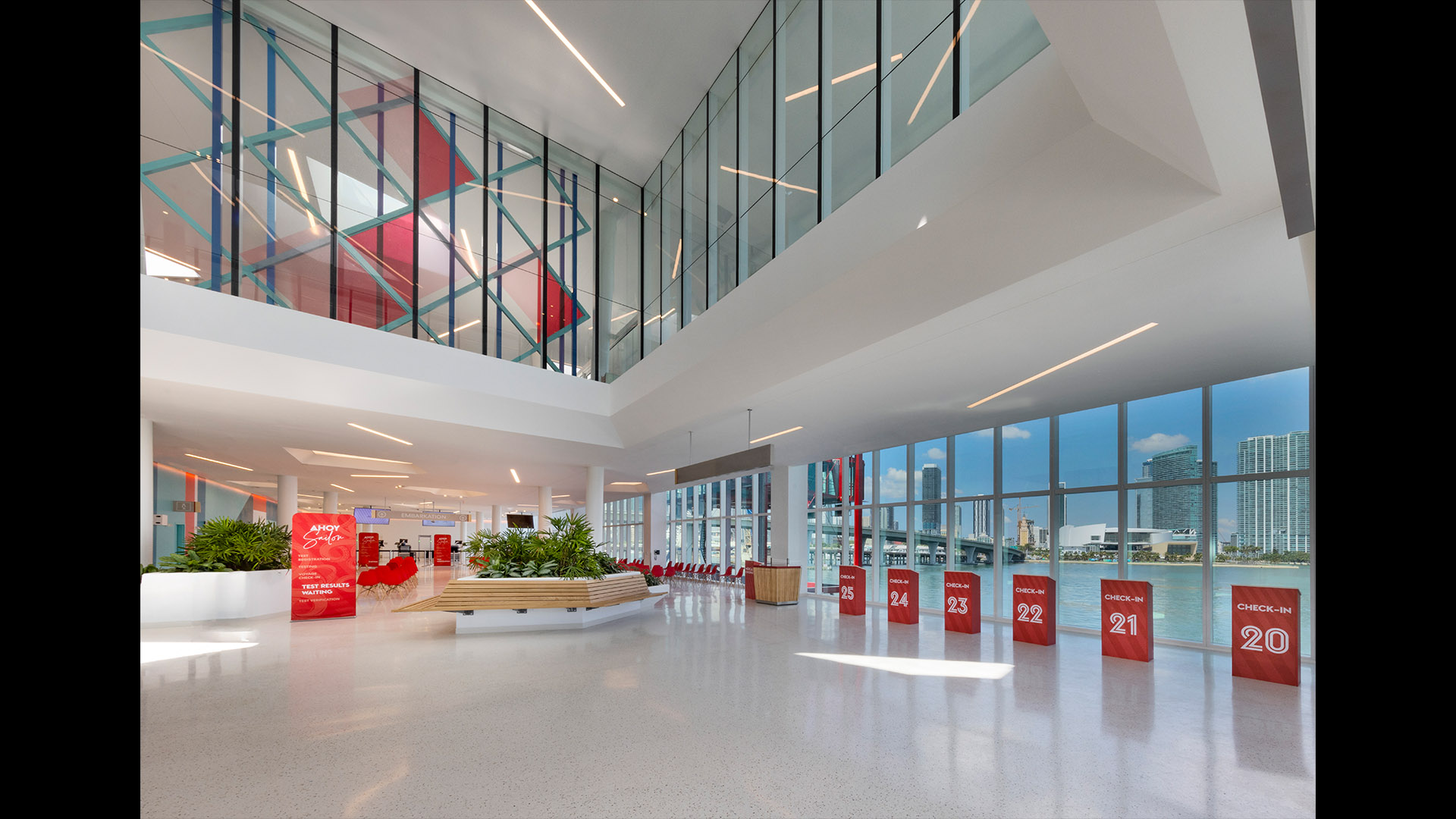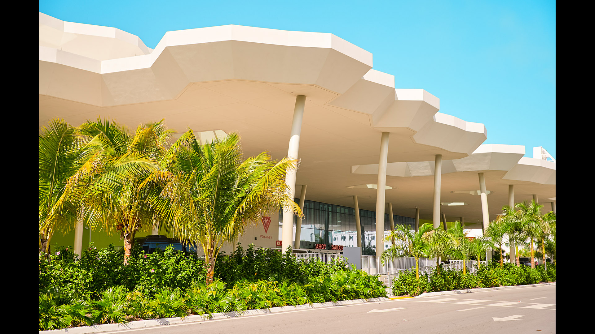 The Flagship cruise terminal for Virgin Voyages features a palm grove-inspired design that abstracts this idea into a series of monumental roofs. The roofs extend way past the edges of the glass pavilions that serve the terminal functions. The jagged edges of the roofs deconstruct the building edges. Gaps between the ‘palms’ filter natural light into the departure lounges and large outdoor terrace overlooking Biscayne Bay and the glorious downtown skyline of the city of Miami.