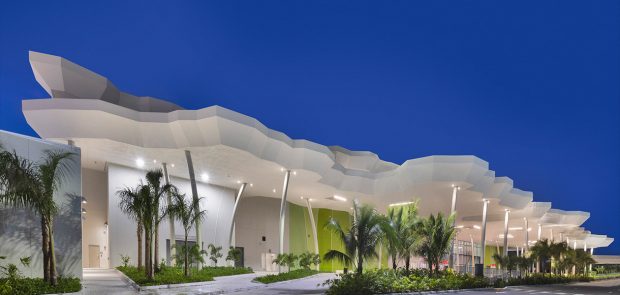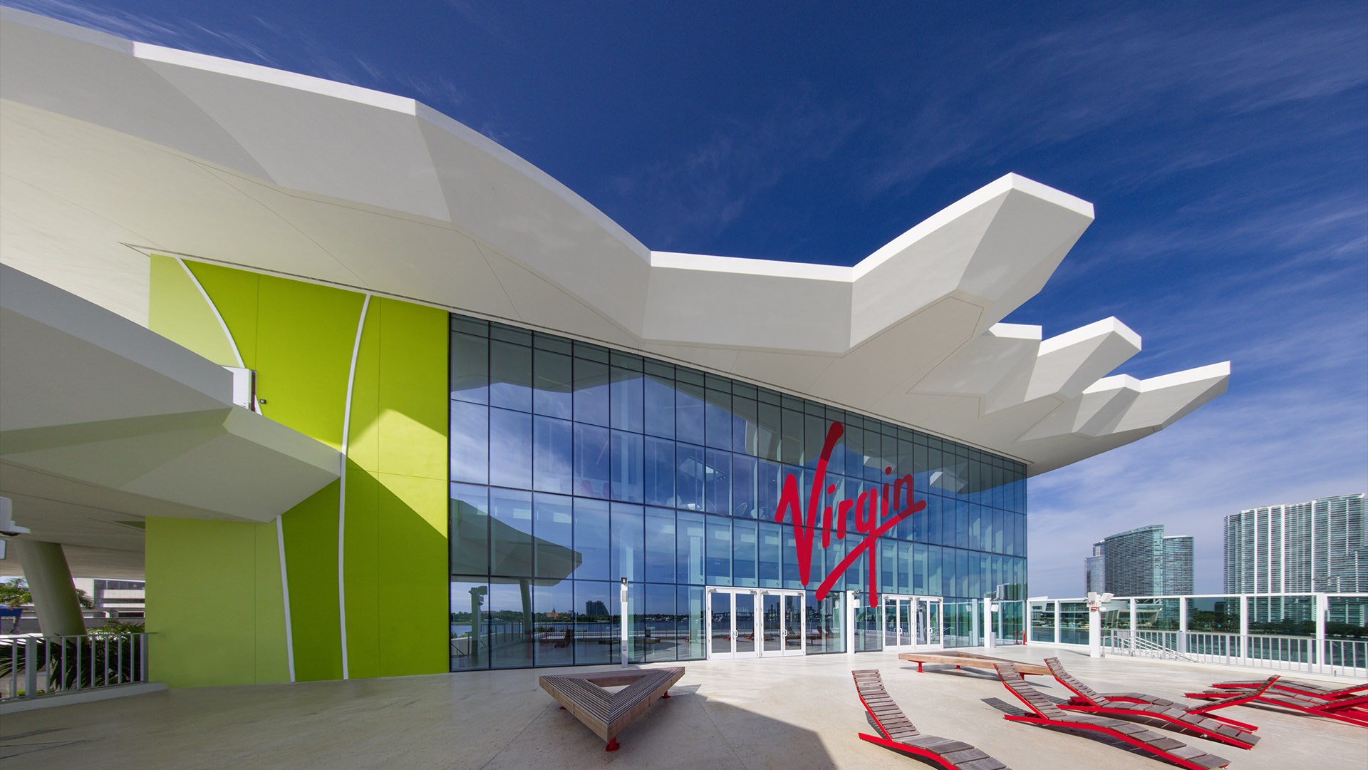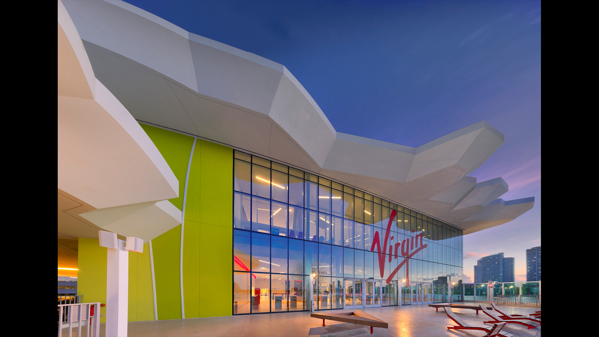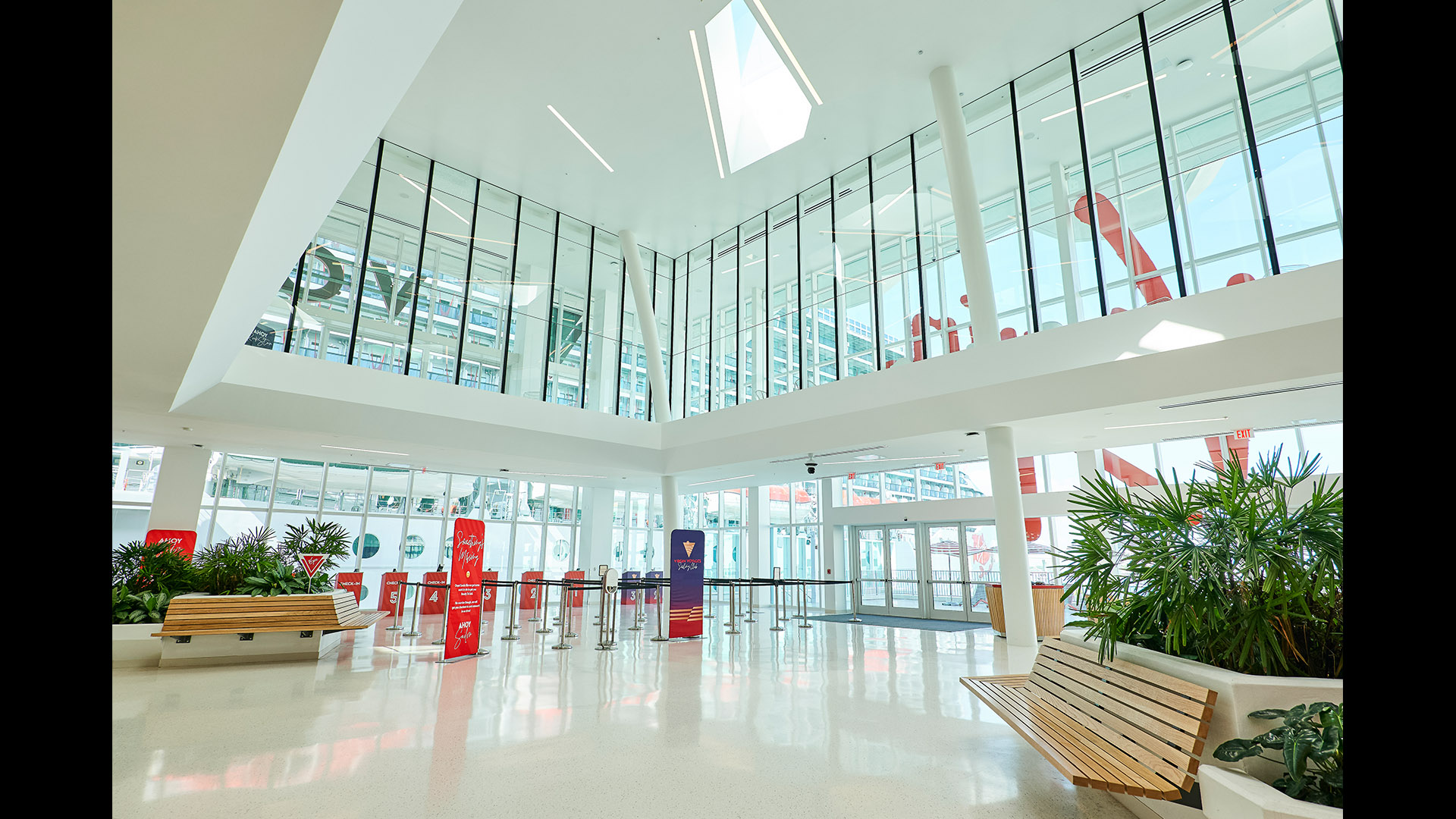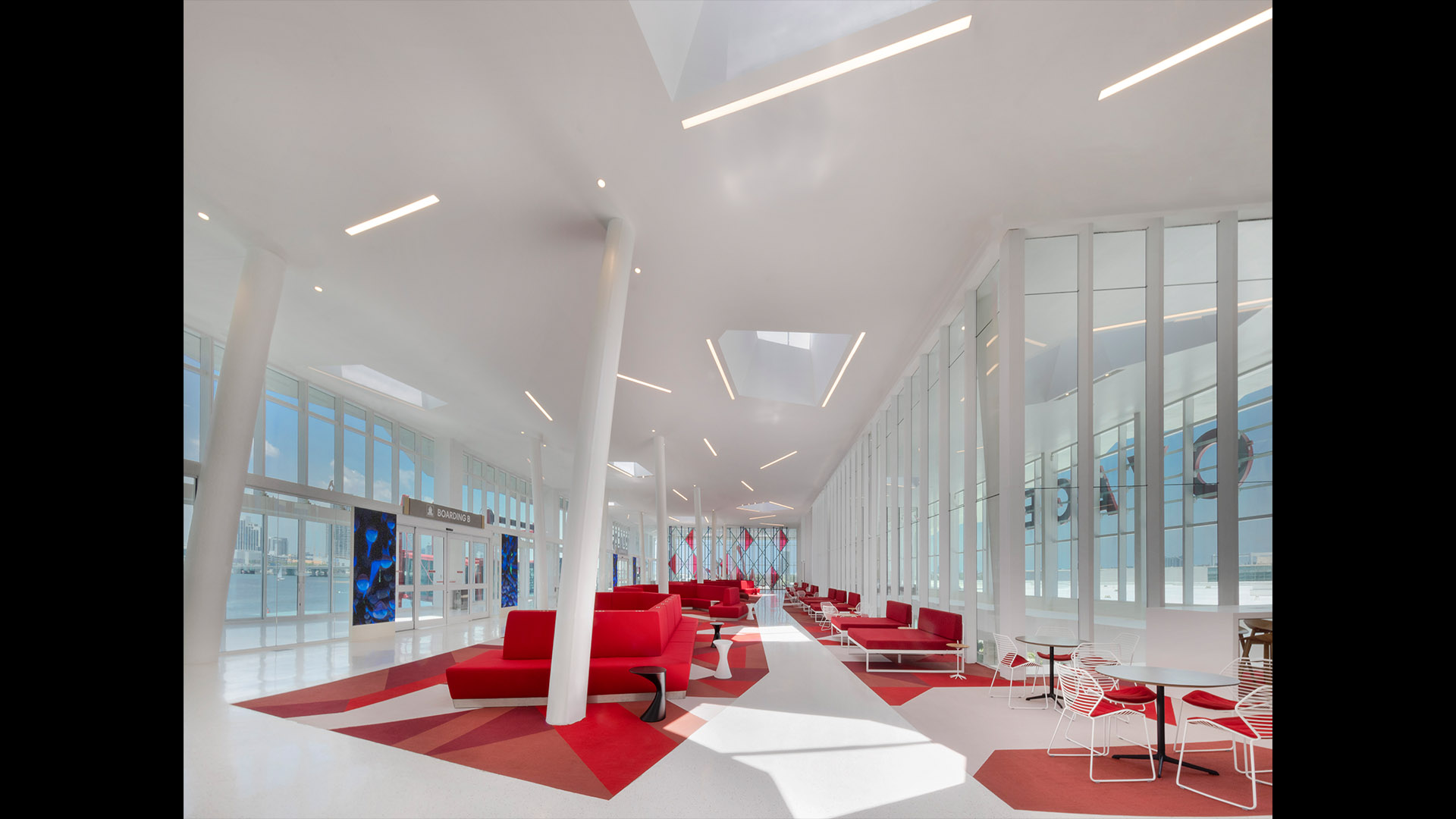 The Flagship cruise terminal for Virgin Voyages features a palm grove-inspired design that abstracts this idea into a series of monumental roofs. The roofs extend way past the edges of the glass pavilions that serve the terminal functions. The jagged edges of the roofs deconstruct the building edges. Gaps between the ‘palms’ filter natural light into the departure lounges and large outdoor terrace overlooking Biscayne Bay and the glorious downtown skyline of the city of Miami.