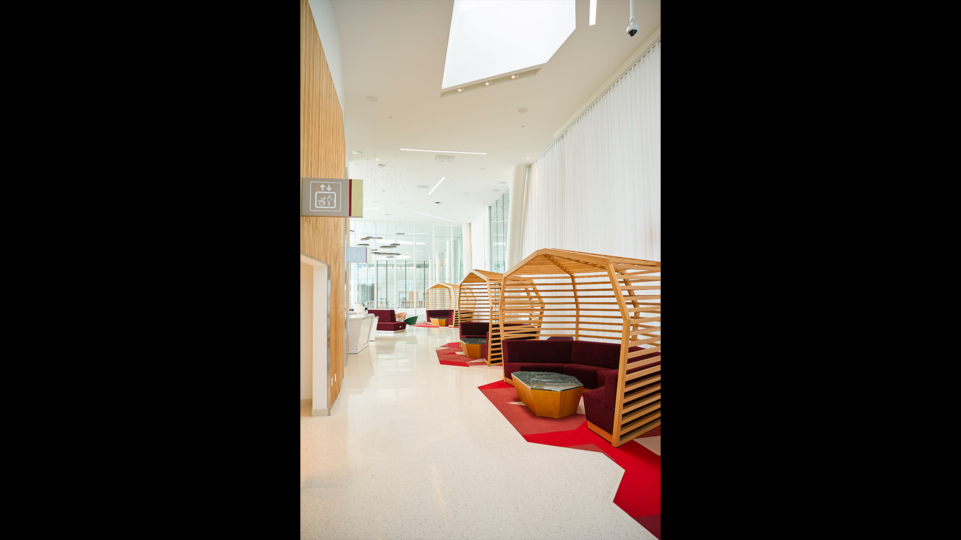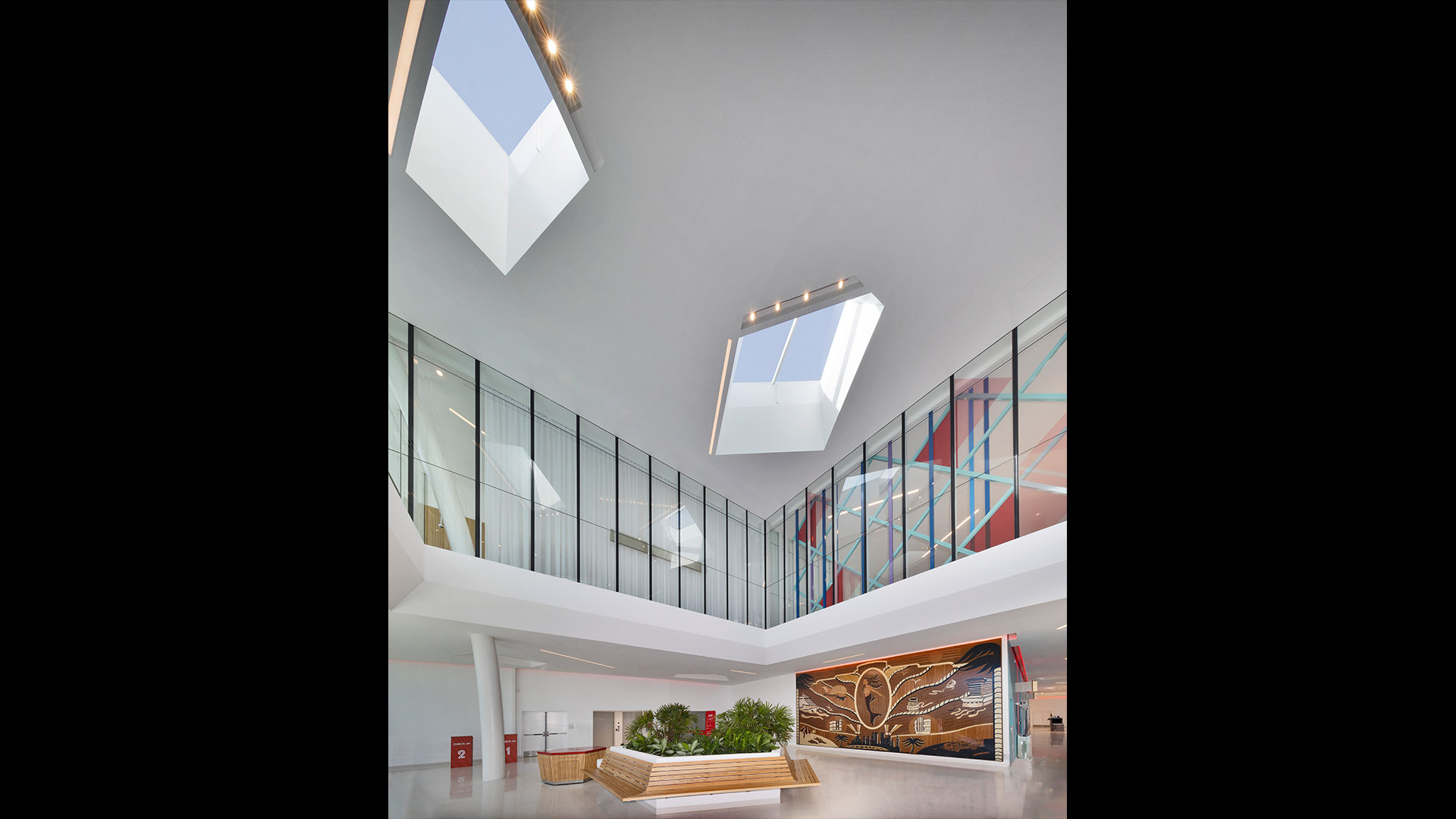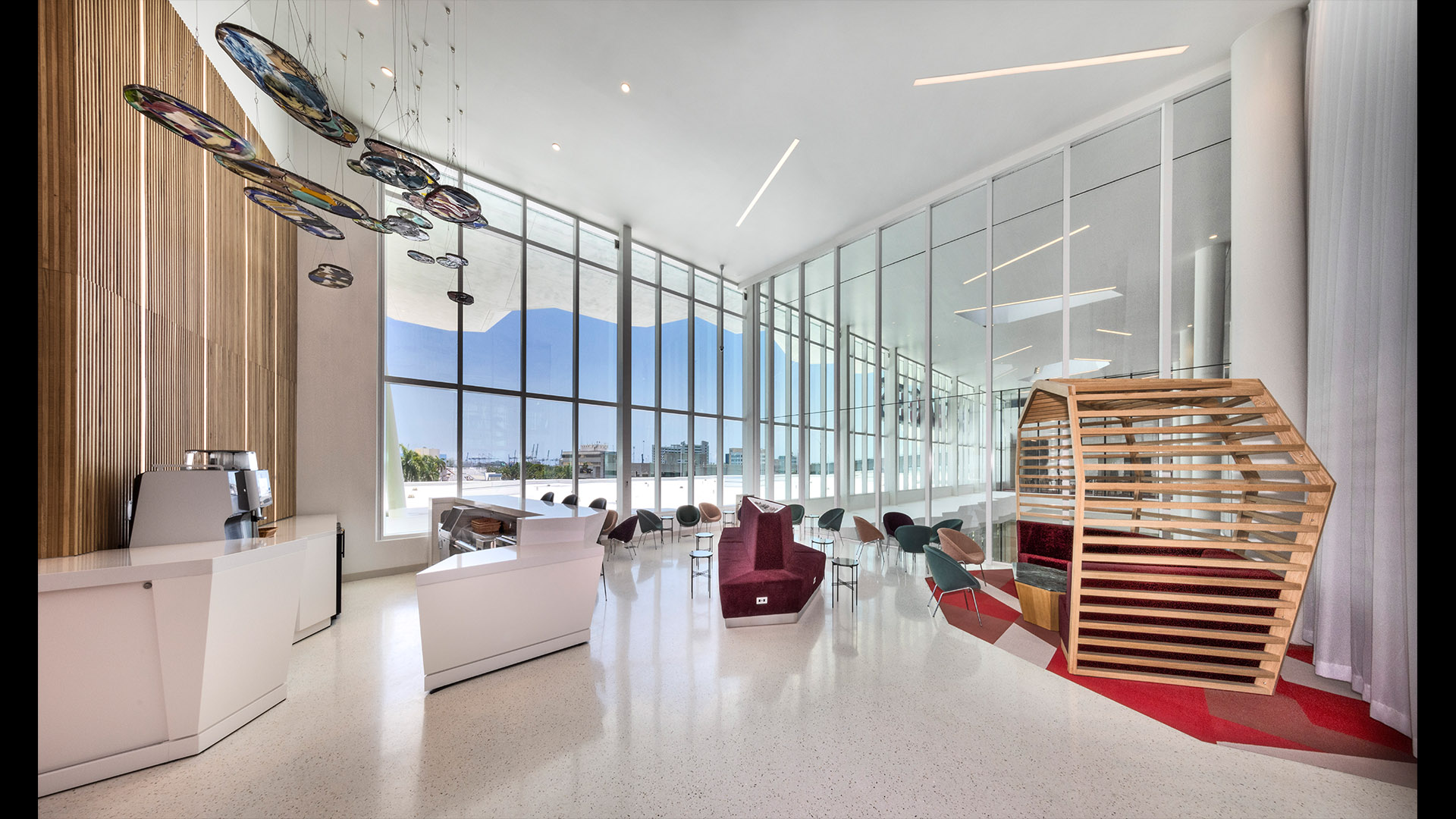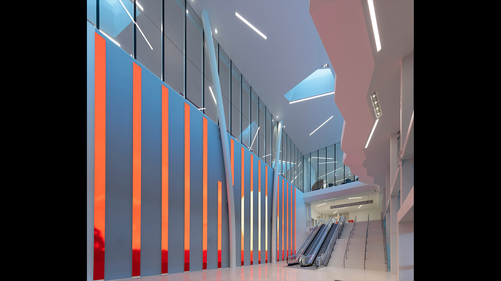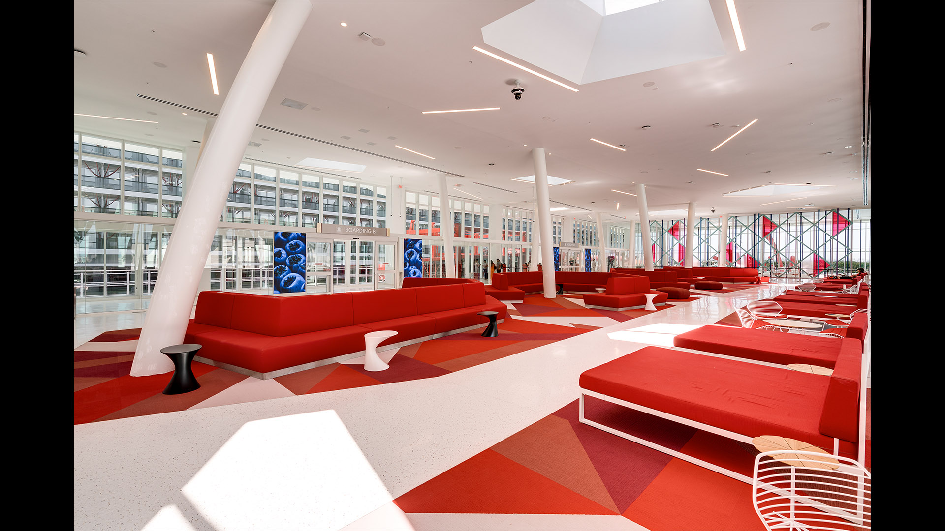 The Flagship cruise terminal for Virgin Voyages features a palm grove-inspired design that abstracts this idea into a series of monumental roofs. The roofs extend way past the edges of the glass pavilions that serve the terminal functions. The jagged edges of the roofs deconstruct the building edges. Gaps between the ‘palms’ filter natural light into the departure lounges and large outdoor terrace overlooking Biscayne Bay and the glorious downtown skyline of the city of Miami.