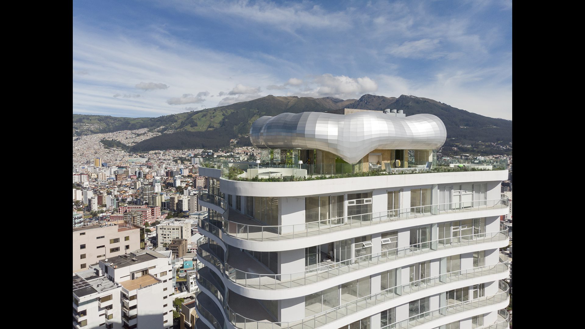 The YOO Quito building has a slender undulating silhouette with vegetation dominating its base and top floor. For interior spaces, the designers coupled traditional regional design with a modern, minimalist aesthetic. Glass, metal, concrete, foliage and a neutral color palette dominate both the interior and exterior of the building.